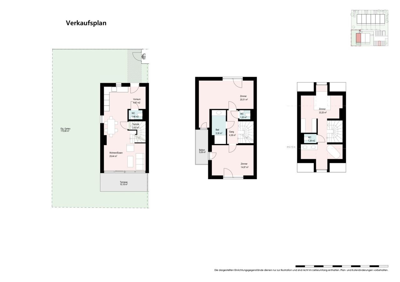 Darüber hinaus verfügen sämtliche Einheiten über Terrassen, teils Balkone sowie Eigengärten, welche von 46 m² bis 149 m² reichen.