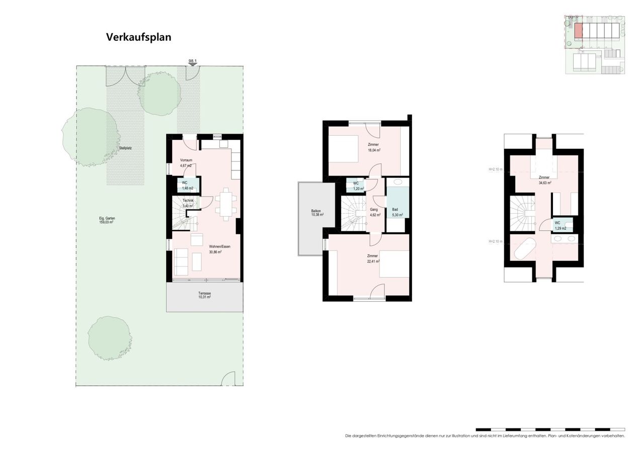 Die hier angebotene Top 98.1. ist ein Eckreihenhaus des großen Baukörpers und misst ca. 127,84m2 Wohnfläche | ca. 10,38m2 Balkon | ca. 10,31m2 Terrasse | ca. 159,03m2 Garten.