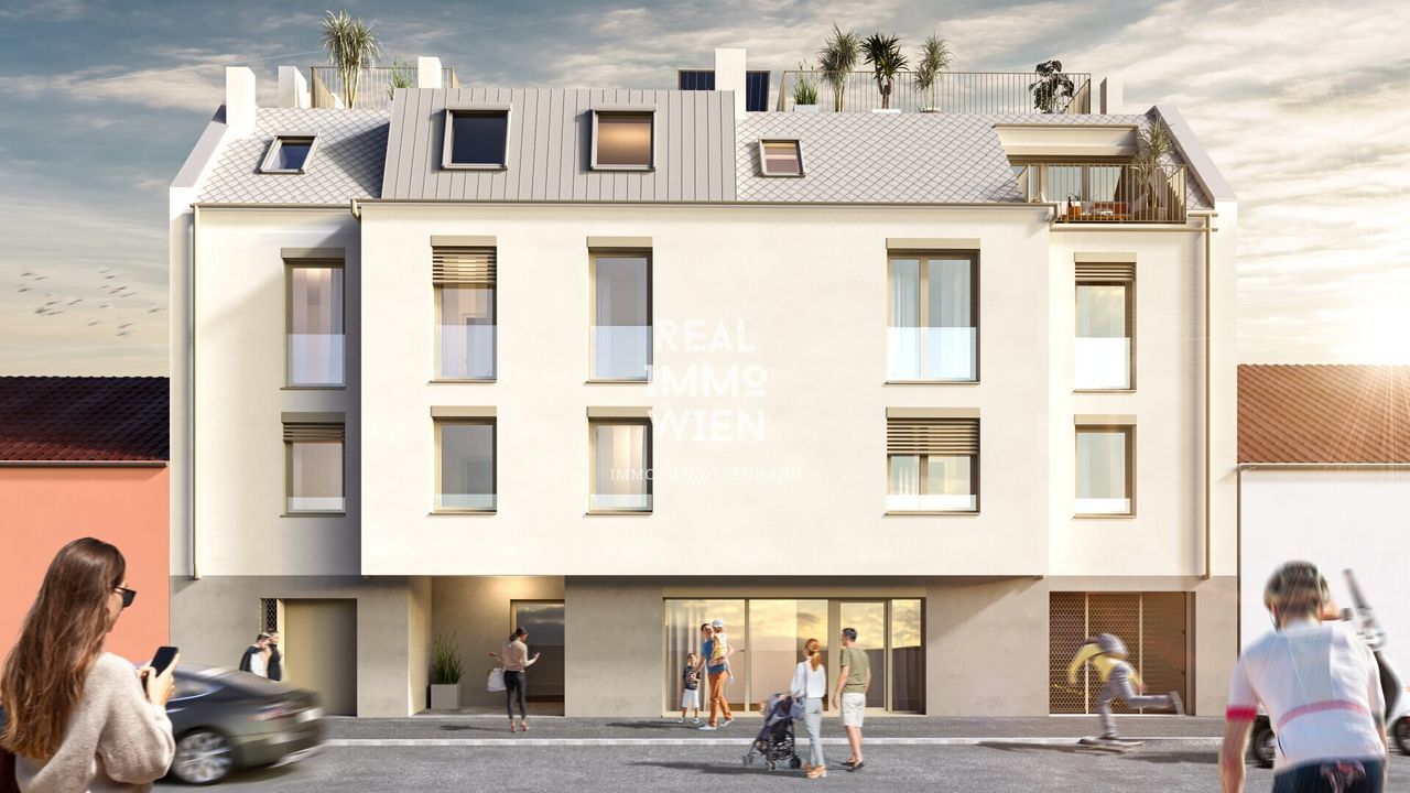 Zum Verkauf gelangen 16 topmoderne, schlüsselfertige Wohnungen mit Außenflächen (Garten, Balkon, Terrassen) sowie 1 Gechäftslokal und 9 Tiefgaragen-Stellplätze.
