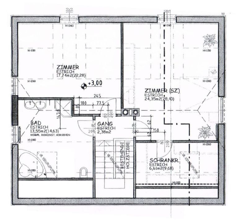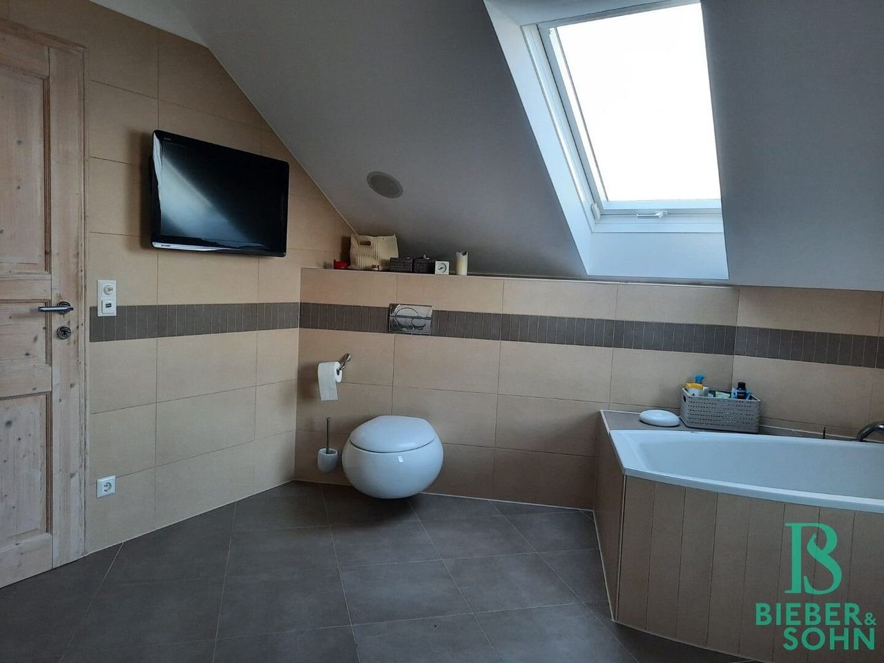Über eine Holztreppe gelangt man zum ausgebauten Dachboden mit einem luxuriös gestalteten ca. 13,5 m² großen Badezimmer. Der Masterbedroom mit angeschlossenem Schrankraum bietet viel Charme durch einen hochwertigen Holzboden und eine offene Deckenkonstruktion. Ein weiteres ca. 18 m² großes Zimmer ist derzeit als Jugendzimmer eingerichtet.