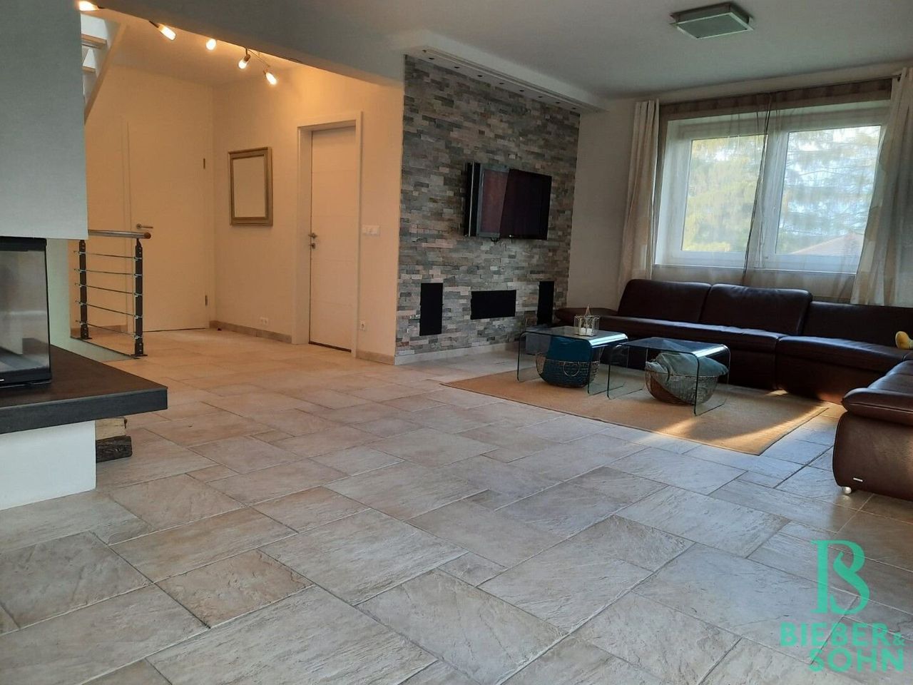 Über eine breite Treppe im Eingangsbereich erreicht man die Gartenebene im Obergeschoss. Ein offenes Wohn- und Esszimmer mit einer Größe von ca. 47 m² und einem wunderschönen, modernen Kamin für die Herbst- und Wintermonate lädt zum Verweilen ein. Ein Beamer mit elektrischer Leinwand schafft Kinoatmosphäre pur. Von hier aus ist die große Süd-West Terrasse ebenerdig zu betreten, genauso wie die ca. 18 m² große Küche, die modern eingerichtet und mit AEG, Grundig Geräten ausgestattet ist (Dampfgarer, Mikrowelle, Backofen, american style Kühlschrank, Geschirrspüler). Ein Gäste-WC und ein weiteres Zimmer/Büro mit ca. 14 m² befinden sich ebenfalls auf dieser Wohnebene.