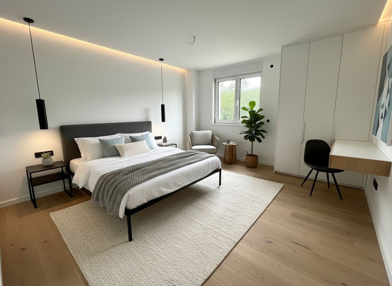 Zwei Etagen, durchdachte Grundrisse, luftige Räume, große Fensterflächen. Im Erdgeschoß: Wohnküche mit Zugang zum Garten, Technikraum, Gäste-WC. Oben: drei Schlafzimmer und ein großzügiges Bad. Kein Platz wird verschwendet – alles ist da, wo man’s braucht.