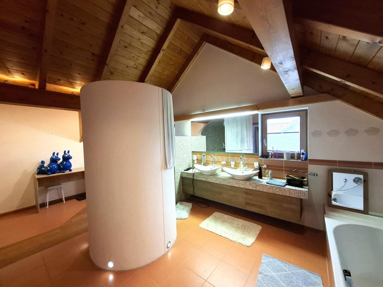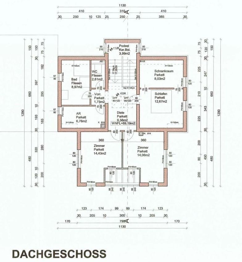 Das Obergeschoss mit ca. 82 m² Wfl. verfügt über 3 Schlafzimmer sowie ein großes Badezimmer, das neben Badewanne, Dusche, WC & Bidet weiteren Platz bietet, z.B. für eine Sauna.