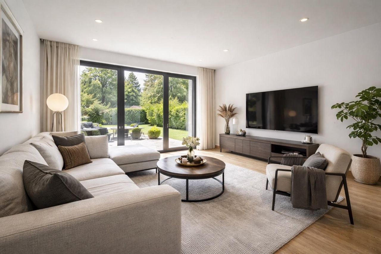 Luft-Wärmepumpen für energieeffizientes Heizen, die optional auf Kühlung erweitert werden können. Die Fußbodenheizung sorgt für eine angenehme Wärme im ganzen Haus und die großen, hochwertigen Qualitätsfenster mit 3-Scheiben-Isolier-Wärmeschutzverglasung tragen zur Energieeffizienz bei.