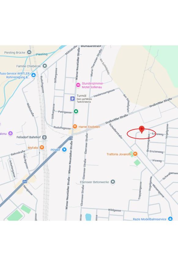 Die Immobilie liegt in einer ruhigen Seitenstraße am Rand der beliebten Maria-Theresien-Siedlung in Eggendorf. Die Umgebung ist geprägt von Einfamilienhäusern, viel Grün und einer angenehmen Nachbarschaft.
