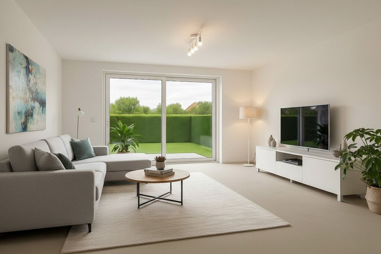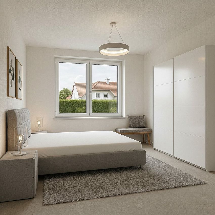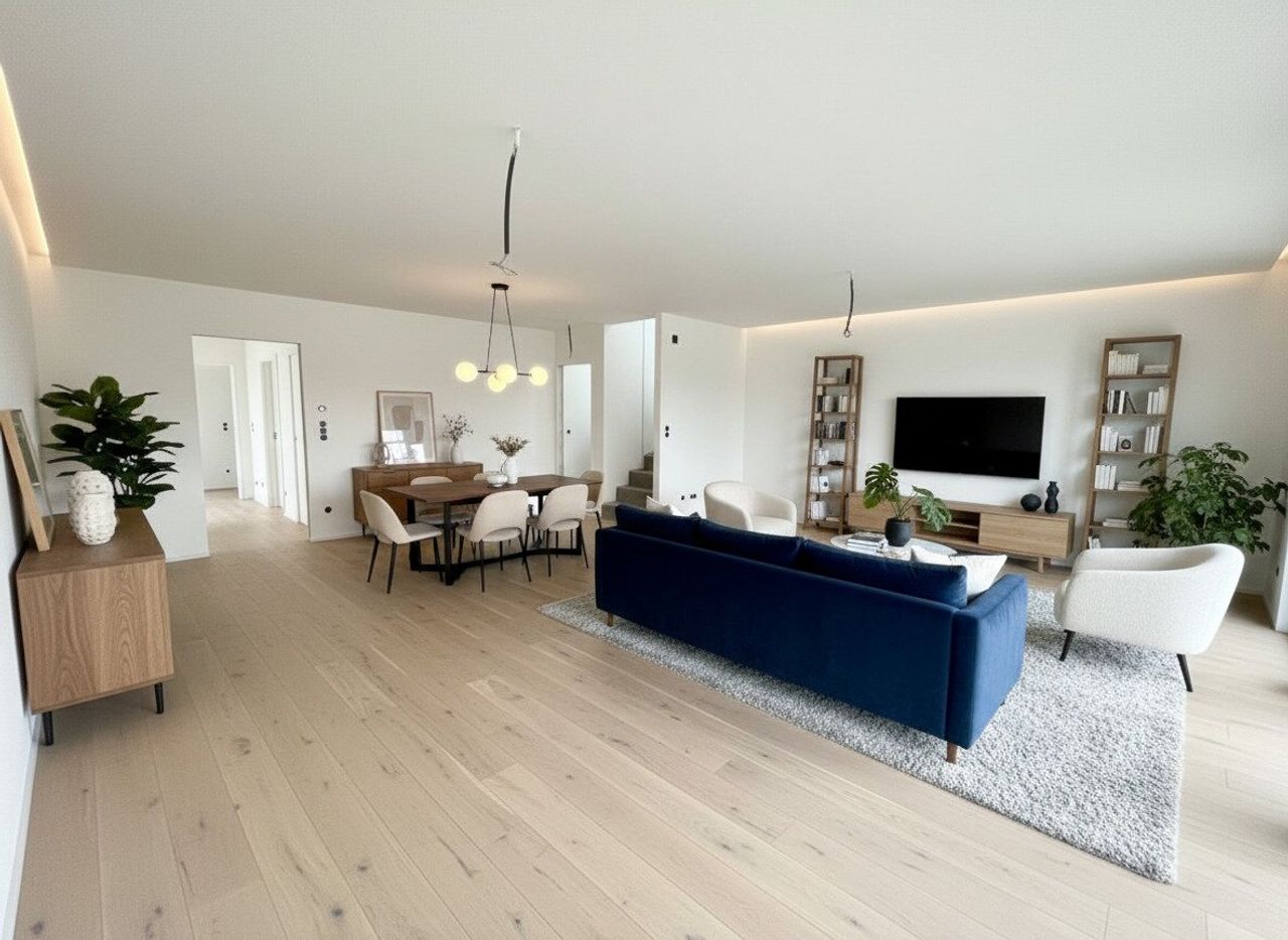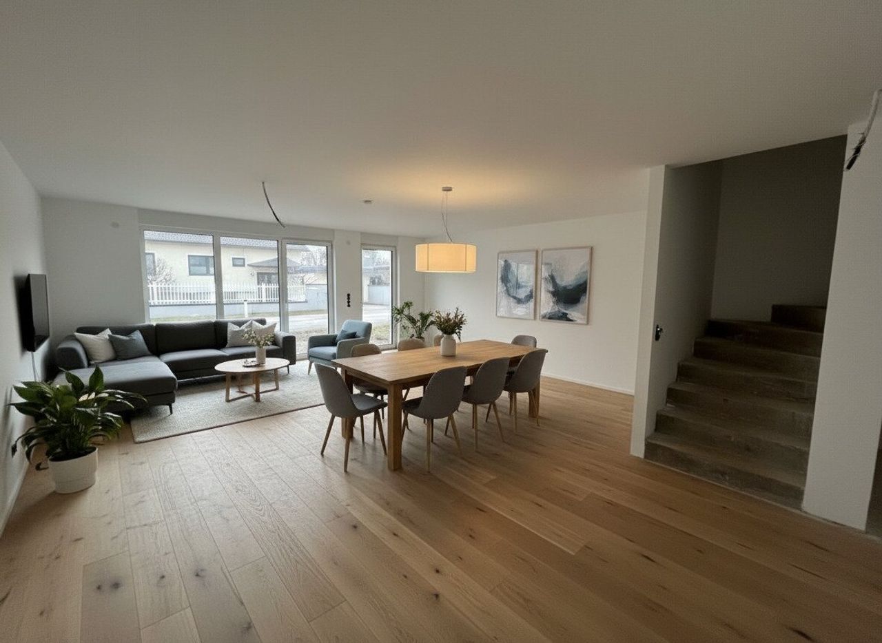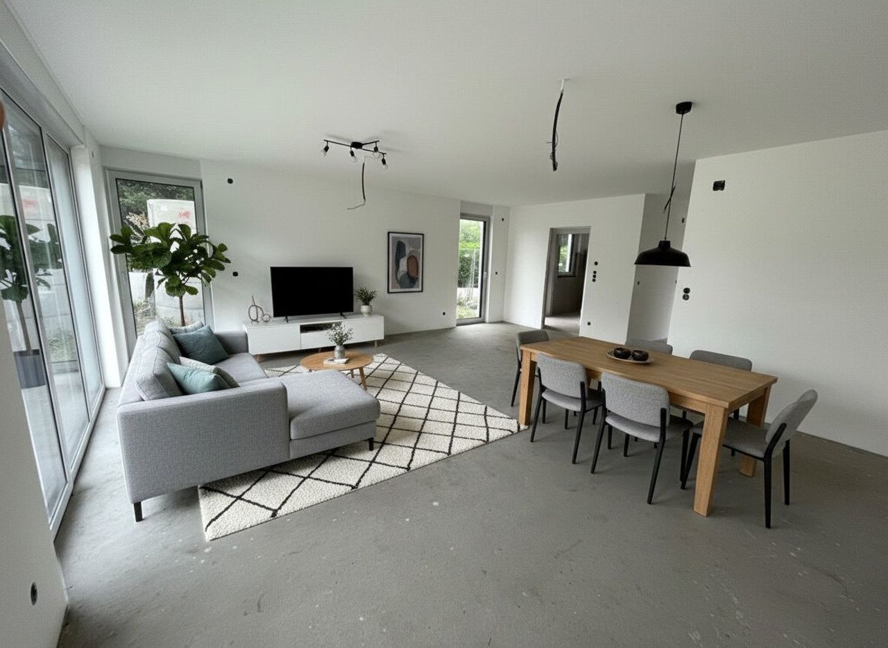 „Die dargestellten Möbel und Einrichtungsgegenstände dienen der besseren räumlichen Vorstellung und wurden mittels KI visualisiert. Sie sind nicht Bestandteil der tatsächlichen Ausstattung der Immobilie.“
