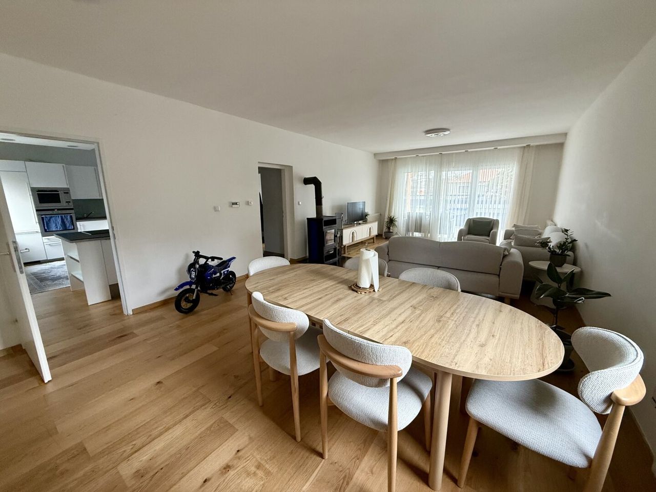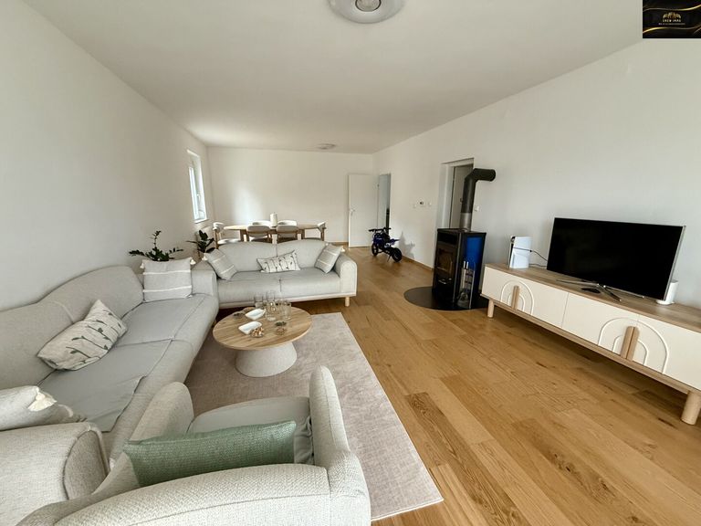 Das Herzstück des Hauses bildet das helle und großzügige Wohnzimmer mit direktem Ausgang auf die Terrasse. Diese lädt zu entspannten Stunden im Freien und gemütlichen Abenden ein.