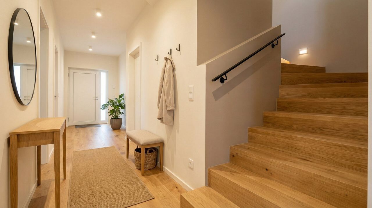 Bereits der liebevoll angelegte Vorplatz bis zur Haustüre vermittelt einen freundlichen und einladenden ersten Eindruck. Der Vorraum ist geräumig und bietet genügend Platz für eine Garderobe und Kommoden. Linkerhand steht Ihnen das 1. Badezimmer zur Verfügung, welches mit Dusche, WC und Handwaschbecken ausgestattet ist. Weiters befinden sich der Technikraum mit Waschmaschinenanschluss und ein praktischer Abstellraum mit ausreichend Stauraum. Rechterhand gelangen Sie in ein Zimmer, welches sich ideal als Home-Office-Büro oder Gästezimmer eignet. Das Wohnzimmer ist hell und wartet auf Ihren persönlichen Touch - exklusive Designküche oder doch minimalistisch-zeitlos?