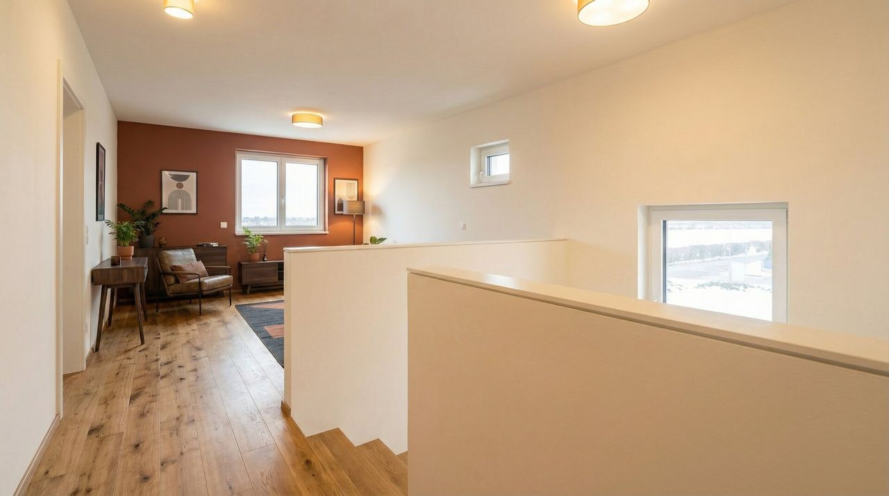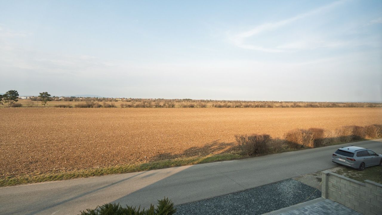 Im Obergeschoß befinden sich 3 Zimmer, welche sich ideal in Schlafzimmer, Kinderzimmer und Gästezimmer/Home-Office einteilen lassen. Alle Zimmer sind zentral begehbar, zusätzlich sorgt der offene Wohnbereich für ein freies Wohngefühl. Zwei der Zimmer genießen einen Weitblick auf das Feld, der die Ruhe direkt ins Zuhause holt. Das Badezimmer im Obergeschoß ist mit Wanne, Doppelhandwaschbecken und Waschmaschinenanschluss ausgestattet.