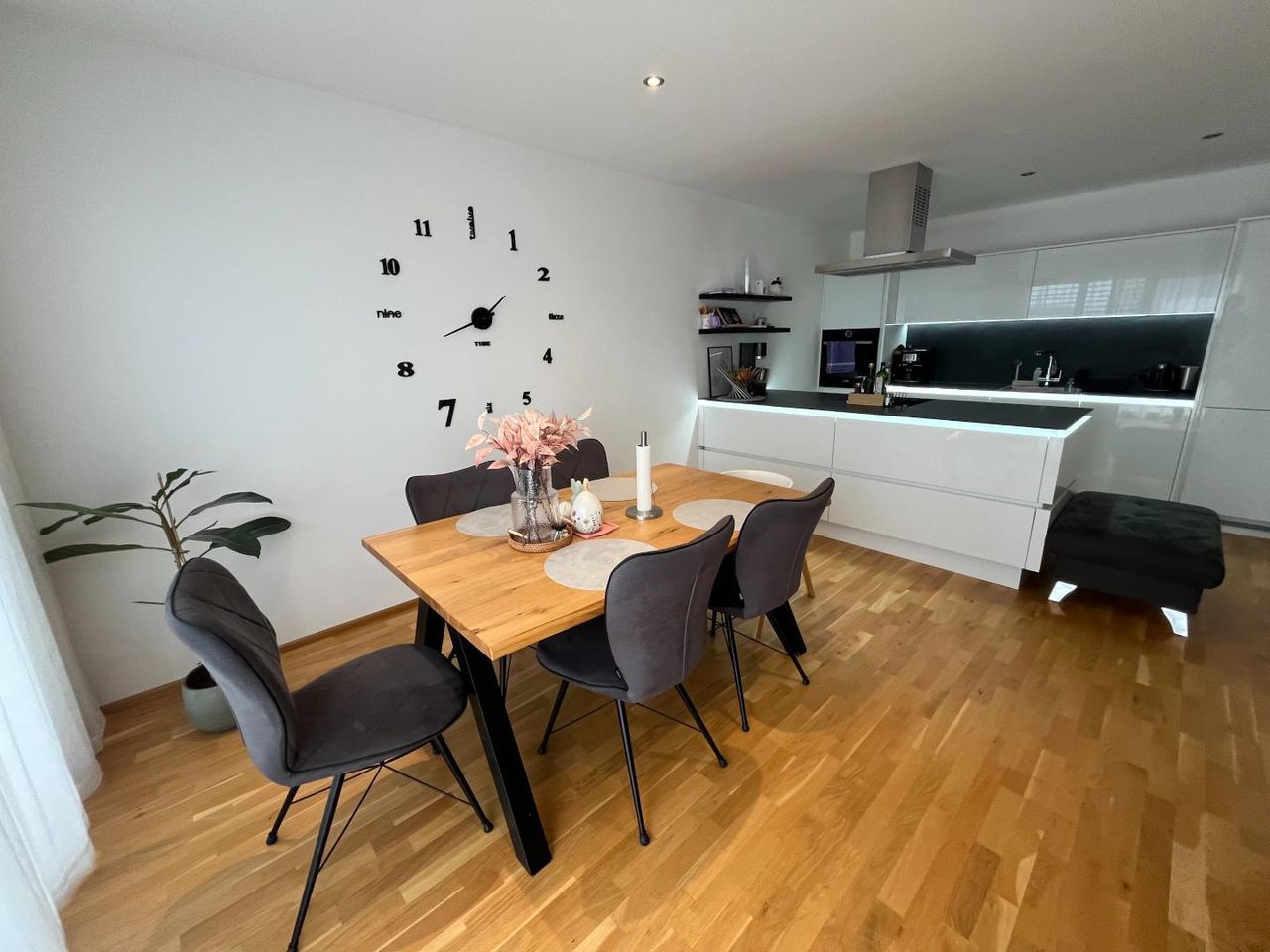 Die offene Wohn-Essküche bildet das repräsentative Herzstück des Hauses und öffnet sich zur Terrasse sowie in den privaten Eigengarten – ein fließender Übergang zwischen Innen- und Außenraum.