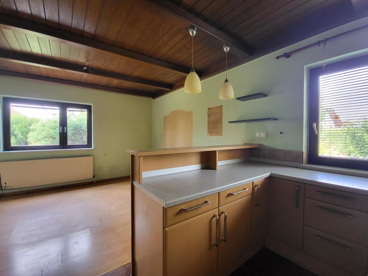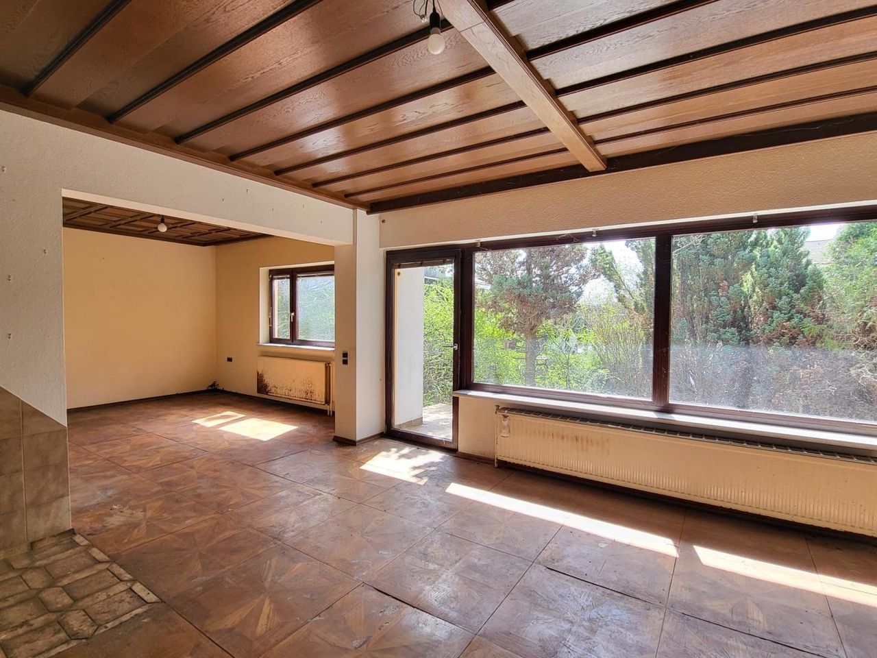 Solider Bungalow in Massivbauweise, mit Renovierungsbedarf, errichtet in den Jahren 1974 bis ca. 1984, Welleternit-Dach, Holzfenster-Isolierglasfenster, Fliesen- bzw. alte Parkettböden, Öl-Zentralheizung mit Radiatoren.