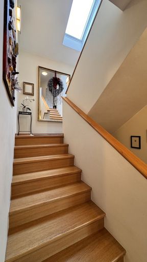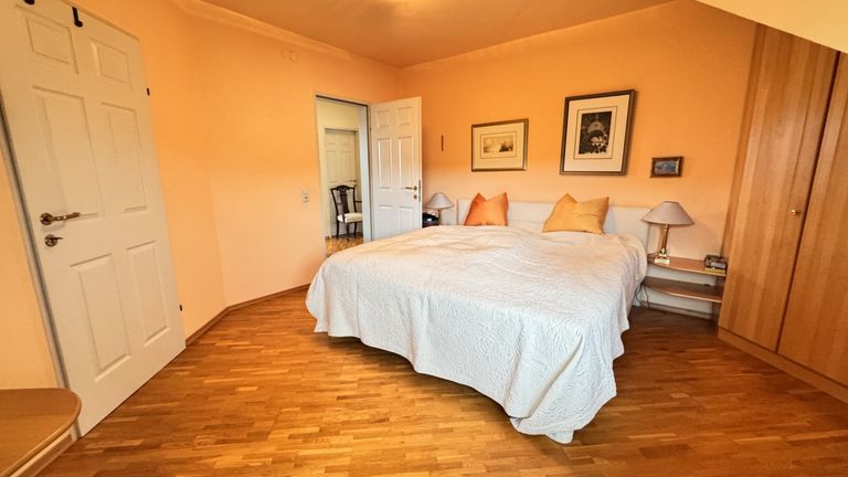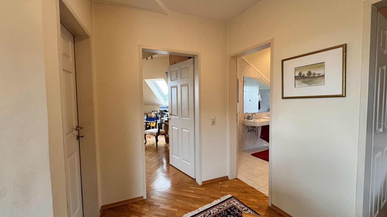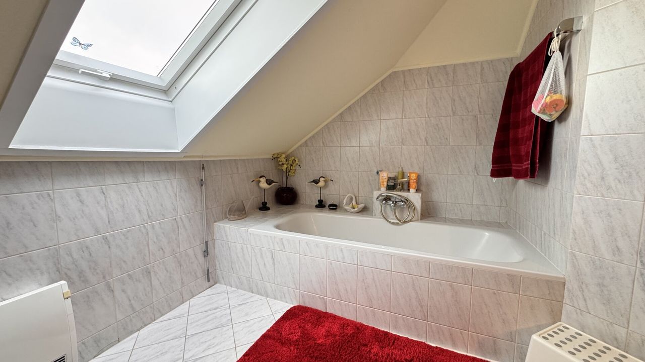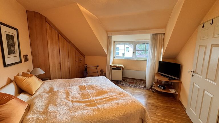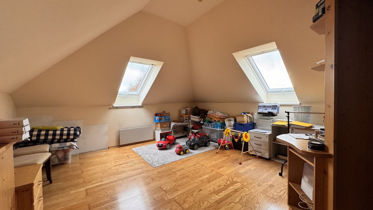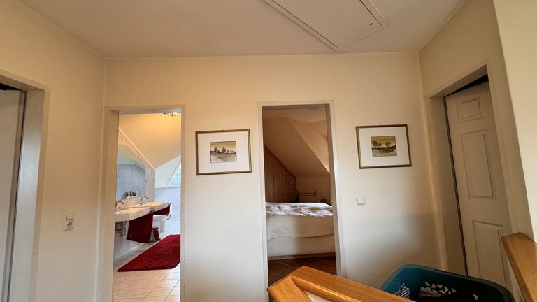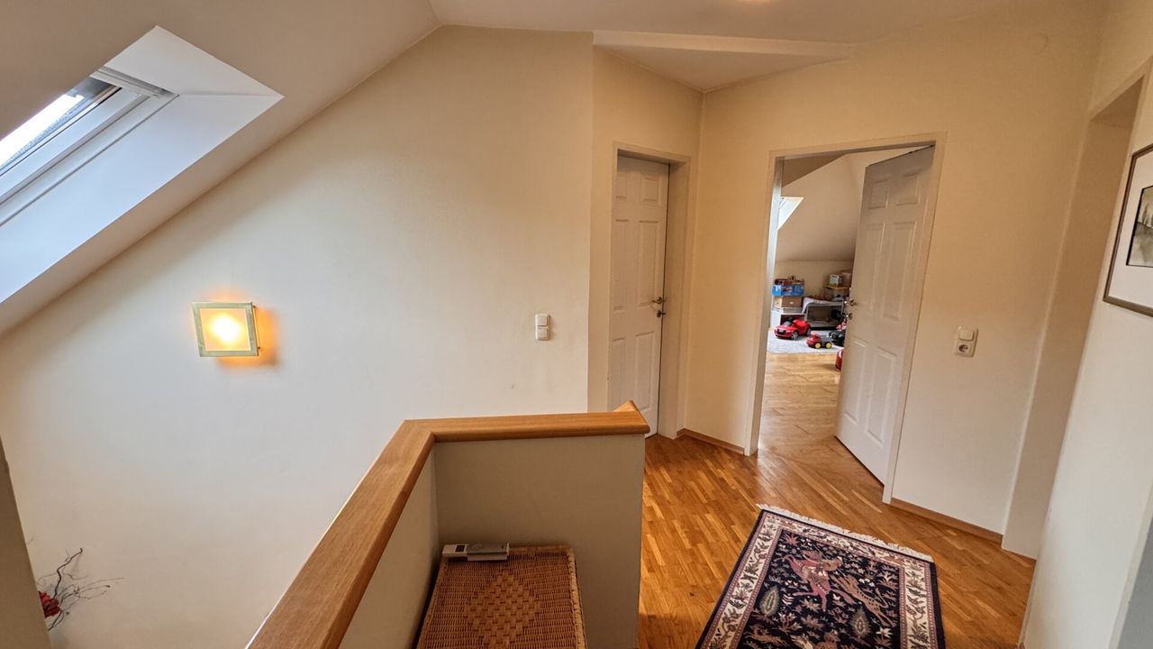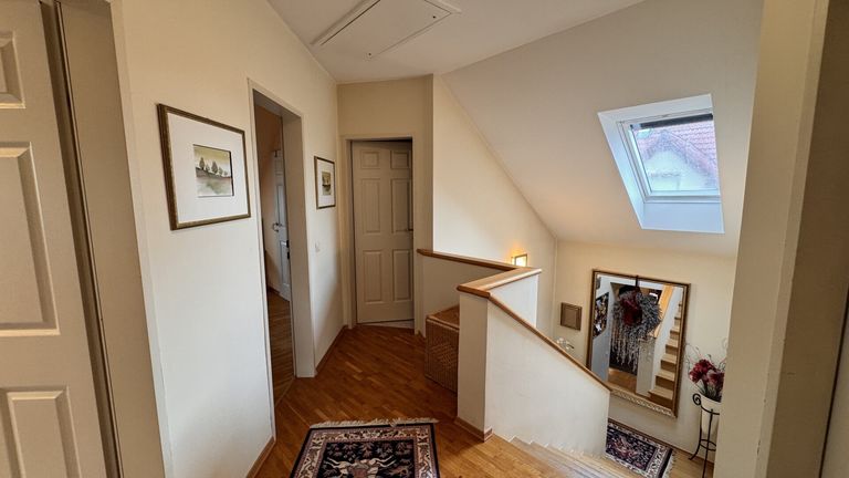 Im Dachgeschoß befinden sich zwei Schlafzimmer mit begehbaren Schränken, ein helles Badezimmer mit Wanne, Bidet und Doppelwaschbecken, ein separates WC sowie ein Abstellraum.