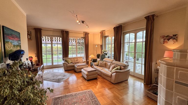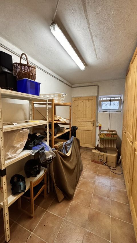 Das Kellergeschoß bietet ein echtes Plus: eine urige Stube mit offenem Kamin, eine Sauna mit Dusche, Wasch- und Technikraum sowie mehrere Abstellräume mit direktem Ausgang in den Garten.