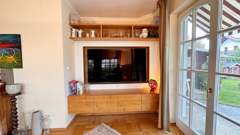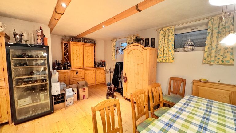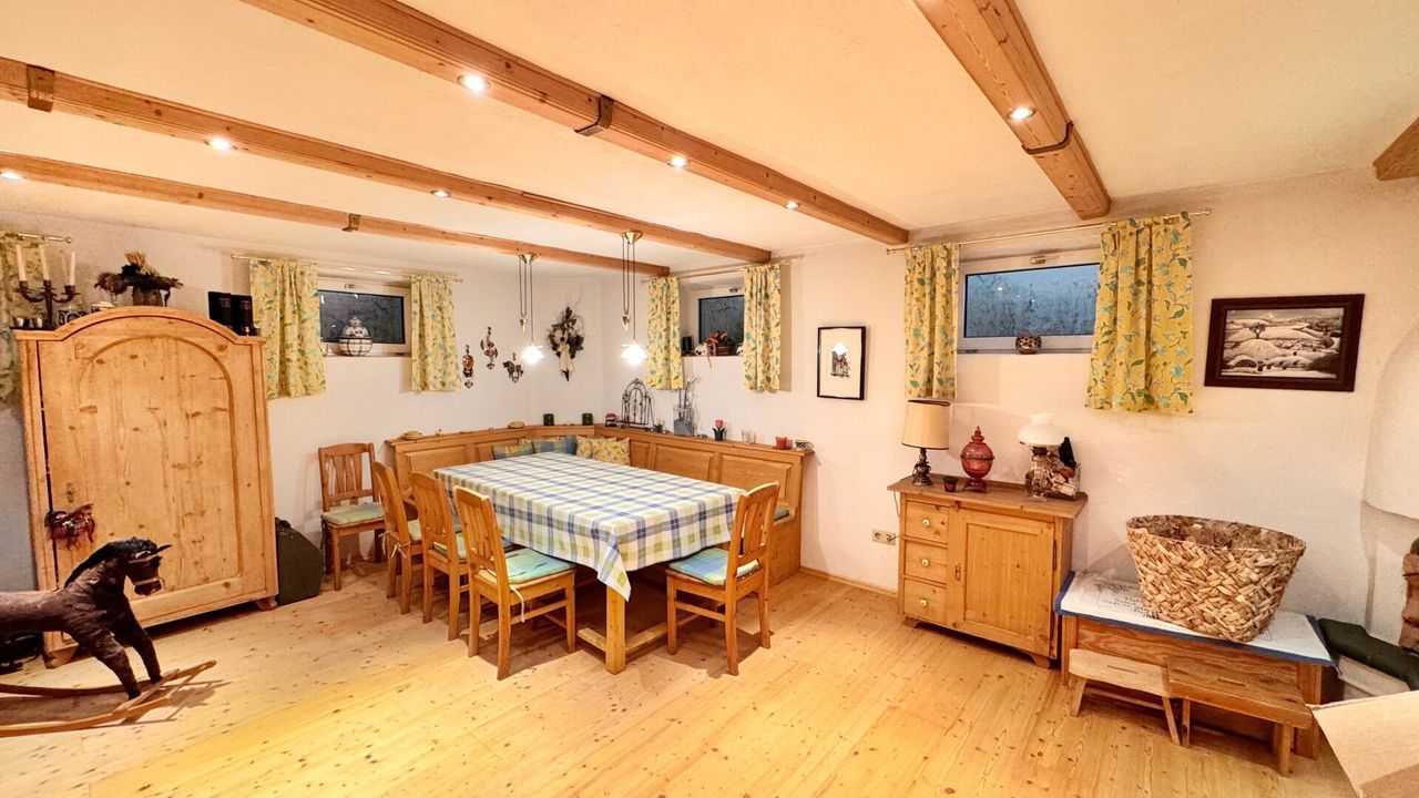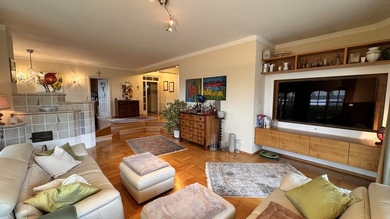 Im Erdgeschoß empfängt Sie ein Vorraum mit Garderobe, einem Bad mit Dusche, ein WC und ein Abstellraum/Schuhraum. Von dort gelangen Sie in einen großzügigen Wohn- und Essbereich mit gemütlichem Kachelofen und zwei Stufen optischer Raumtrennung zum Wohnzimmer mit dadurch erhöhter Raumhöhe. Die Tischler-TV-Wand und der 75 Zoll Samsung Smart-TV verbleiben im Haus. Eine gemütliche Tischlerküche mit Sitzecke, Dampfgarer, Backrohr und Speis und ein Gästezimmer bzw. Büro ergänzen das Raumangebot.