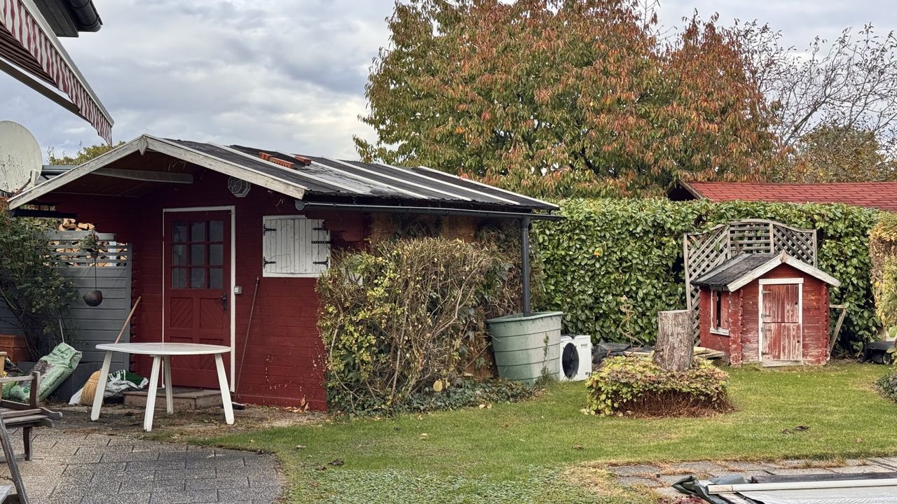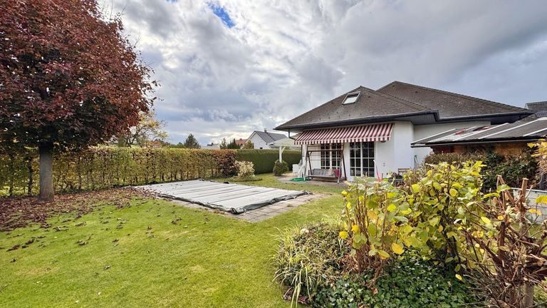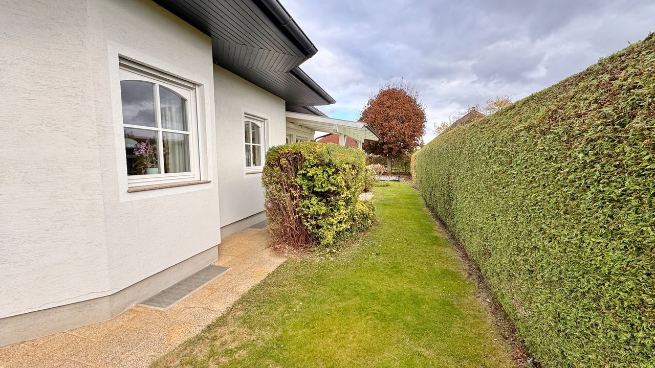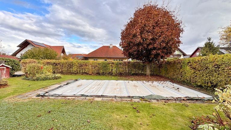 Der gepflegte Garten überzeugt mit seiner überdachten Terrasse sowie der Freiluftterrasse mit elektrischer Markise, Gerätehütte, Holzlager und einem 4×8 m großen, beheizten Pool (1,60 m Tiefe). Ein idealer Platz zum Entspannen und Genießen.