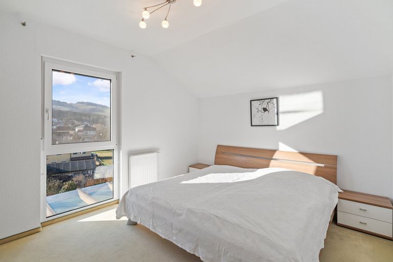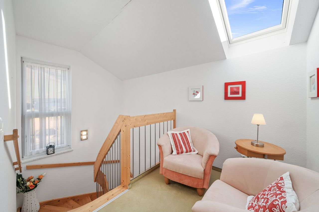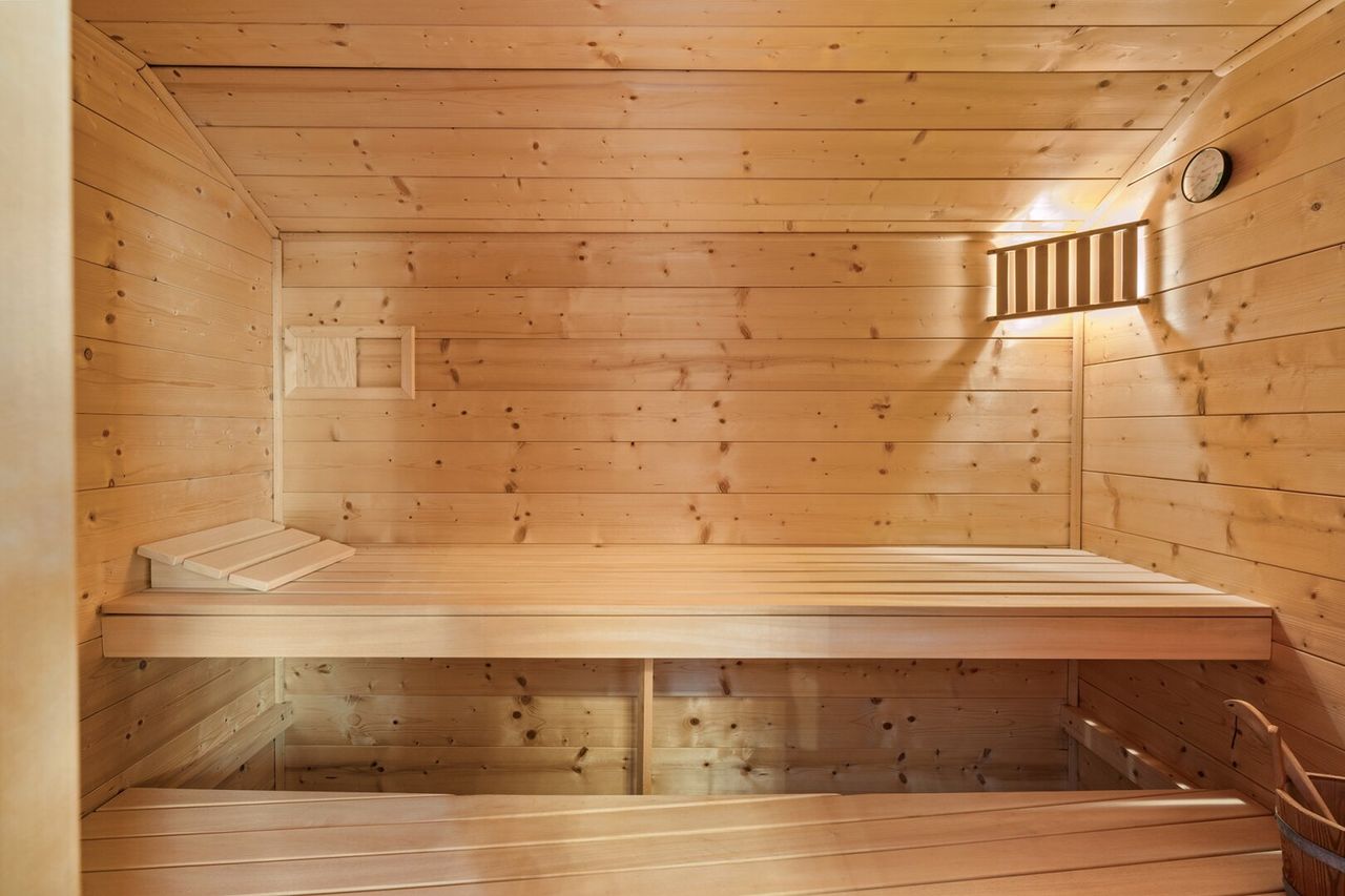 Im Obergeschoss stehen zwei Schlafzimmer, ein separater Schrankraum sowie ein großzügiges Badezimmer mit Dusche, Badewanne und integrierter Sauna zur Verfügung und bieten einen privaten Rückzugsbereich mit zusätzlichem Komfort.
