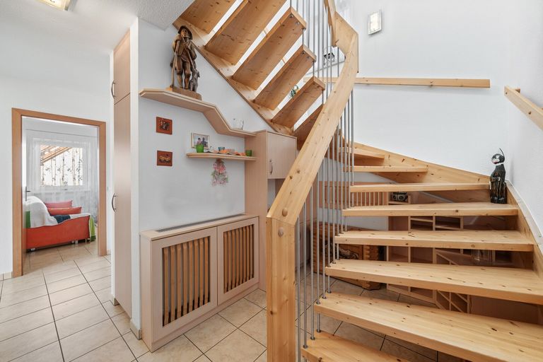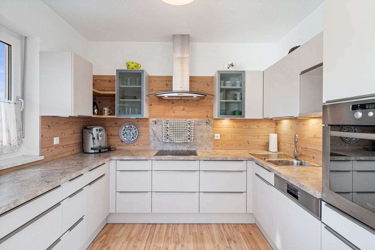 Die Küche ist hochwertig und zeitlos ausgestattet und fügt sich harmonisch in das Wohnkonzept ein. Auf der Erdgeschossebene befinden sich zudem ein weiteres Zimmer sowie ein WC mit Waschmaschinenanschluss.