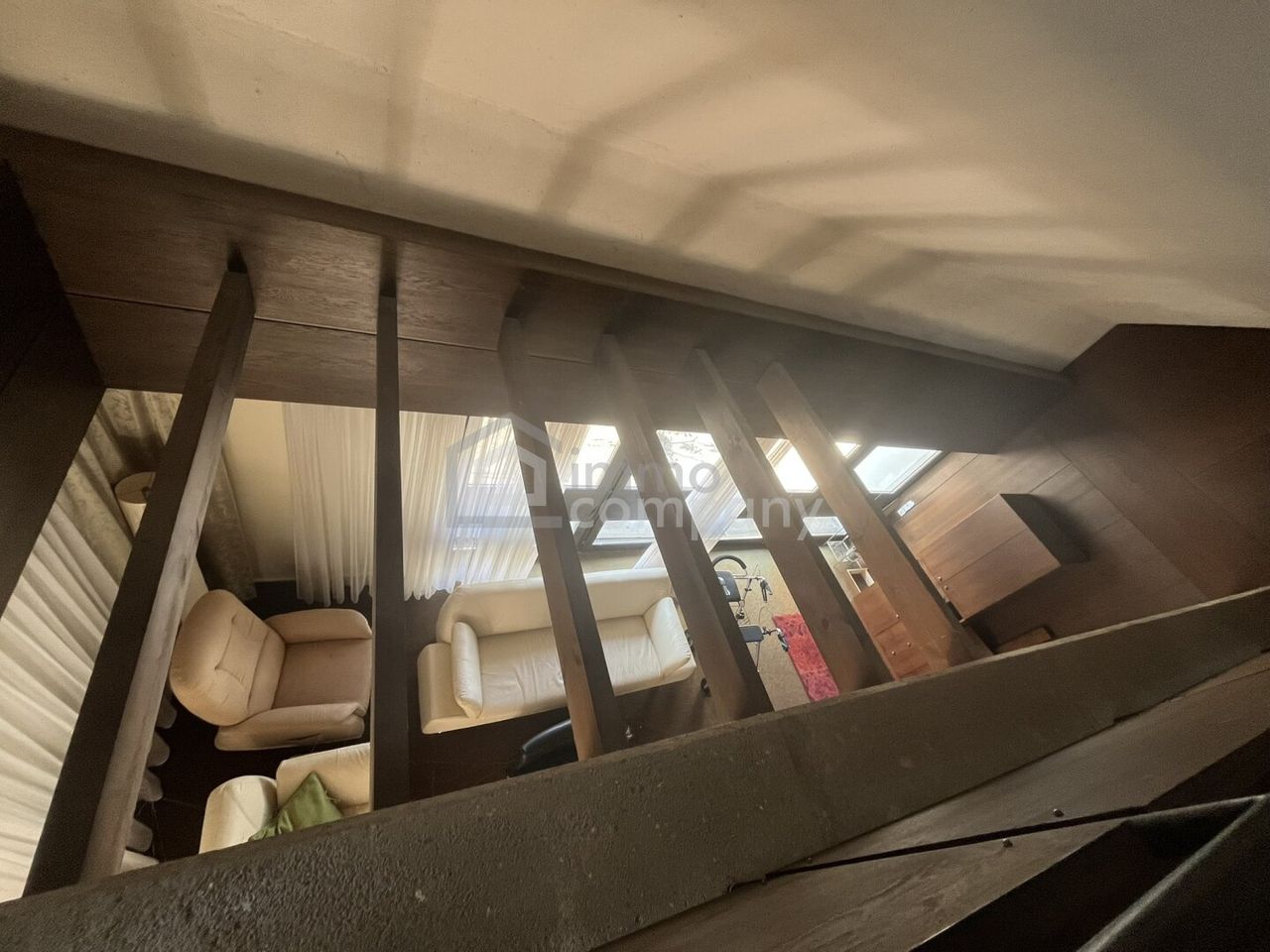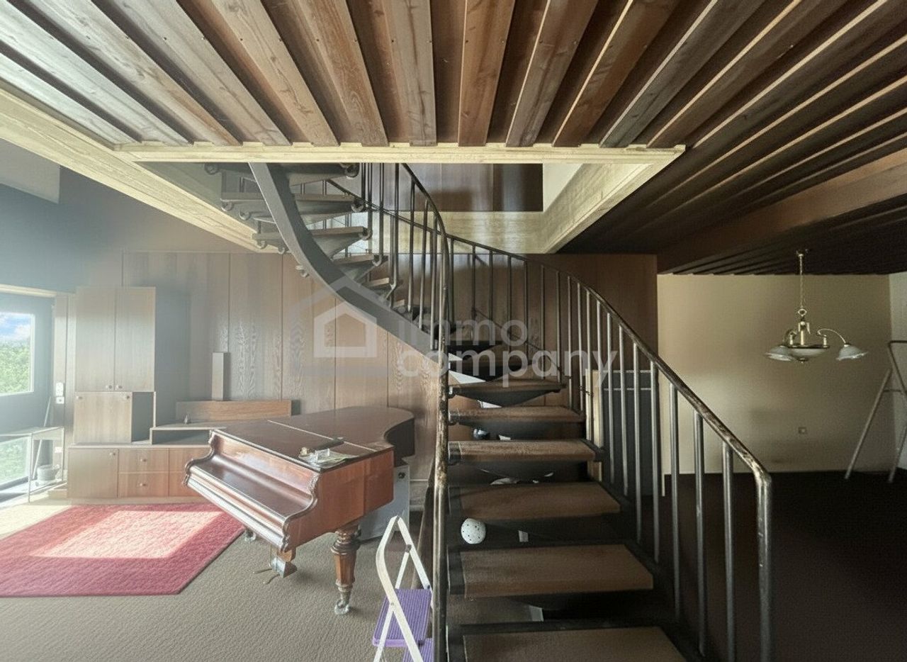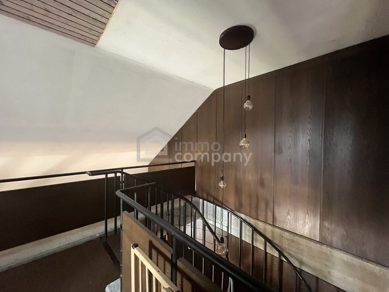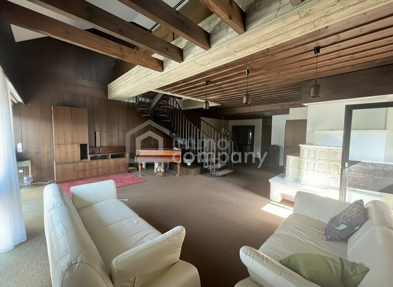 Das absolute Highlight ist das beeindruckend großzügige Wohnzimmer mit Kachelofen und Klavier – ein Raum mit Atmosphäre und Charakter. Die Verbindung der Ebenen schafft ein einzigartiges Raumgefühl, das man selten findet. Von hier aus gelangen Sie direkt auf die schöne Terrasse und in den Garten. Besonders architektonisch reizvoll ist der teilweise offene Blick zur Galerie im Obergeschoss, der dem Wohnraum zusätzliche Weite und Licht verleiht. Eine stilvolle Treppe führt ins obere Stockwerk.