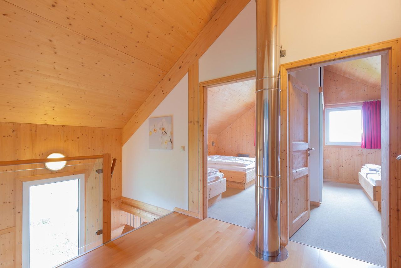 Das Obergeschoss teilt sich in 4 komfortable Schlafzimmer, die insgesamt Platz für 9 Personen bieten. Hier findet sich auch das zweite Badezimmer mit Whirlwanne und WC.