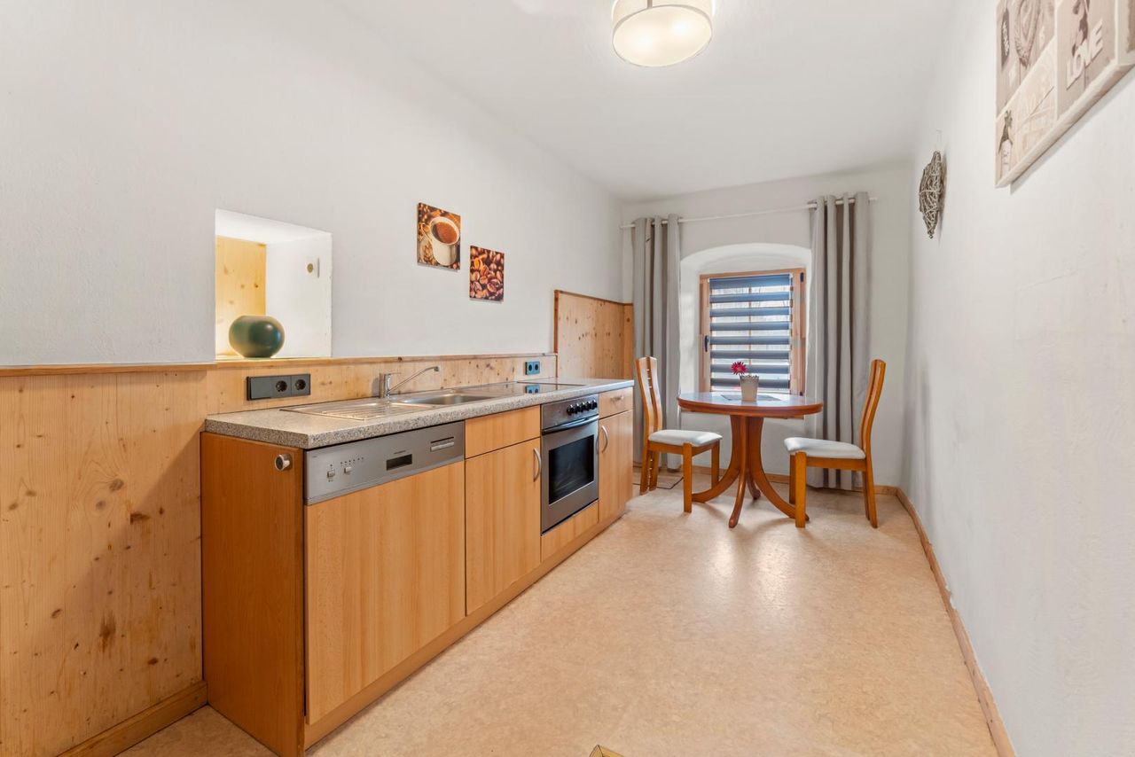 Im Erdgeschoss stehen ca. 93,42 m² Wohnfläche zur Verfügung. Zwei Vorräume schaffen ein großzügiges Entree, dort befindet sich eine Öffnung, die es ermöglicht, einen Aufgang ins Dachgeschoss zu errichten. Aktuell gelangt man ins Dachgeschoss über eine Außentreppe. Die Küche fügt sich charmant in den rustikalen Stil ein. Ein großzügiges Zimmer überzeugt durch seine Atmosphäre und bietet viel Platz für individuelle Gestaltungsideen. Das geräumige Badezimmer, das mit Dusche, WC und Waschtisch ausgestattet ist, rundet das Raumangebot ab.
