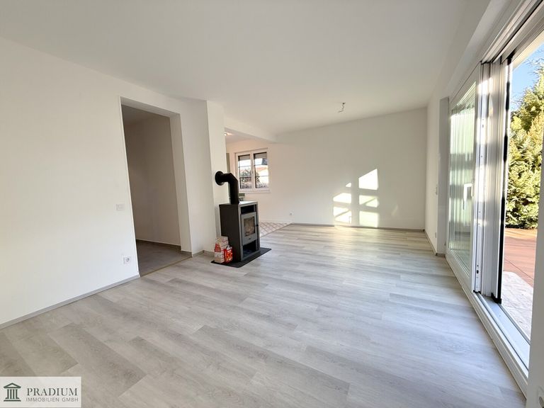 Im Erdgeschoss erwartet Sie ein weitläufiges Wohn- und Esszimmer, das durch seine offene Gestaltung und Helligkeit besticht. Ein gemütlicher Schwedenofen sorgt in den kühleren Monaten für eine behagliche Atmosphäre. Von hier aus gelangen Sie über eine große Schiebetüre direkt auf die großzügige Terrasse, die zum Entspannen und Verweilen einlädt. Ergänzt wird das Raumangebot im Erdgeschoss durch eine separate Gästetoilette.