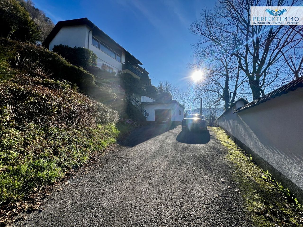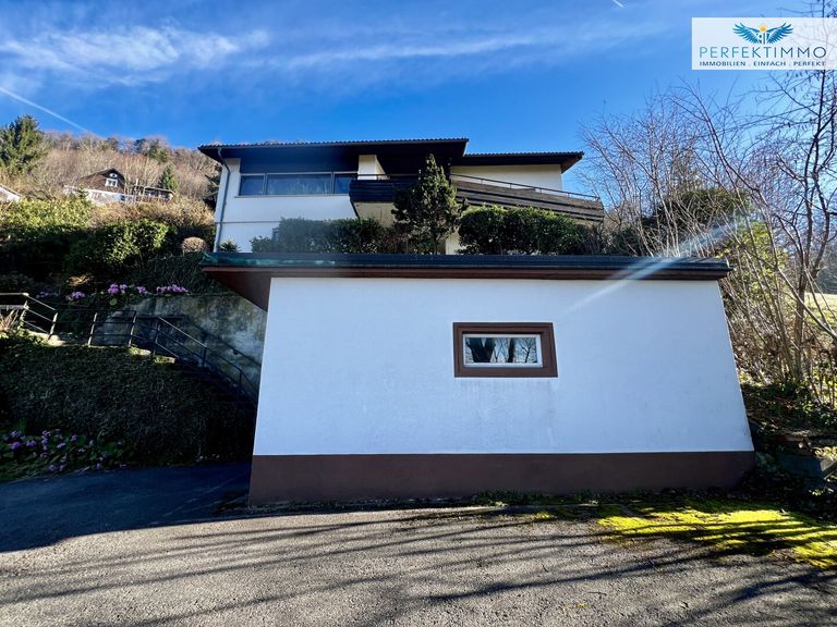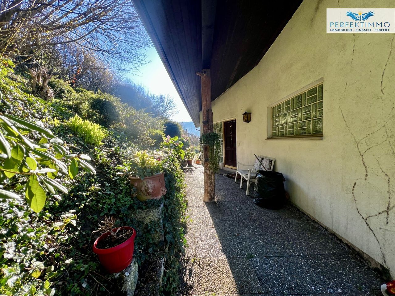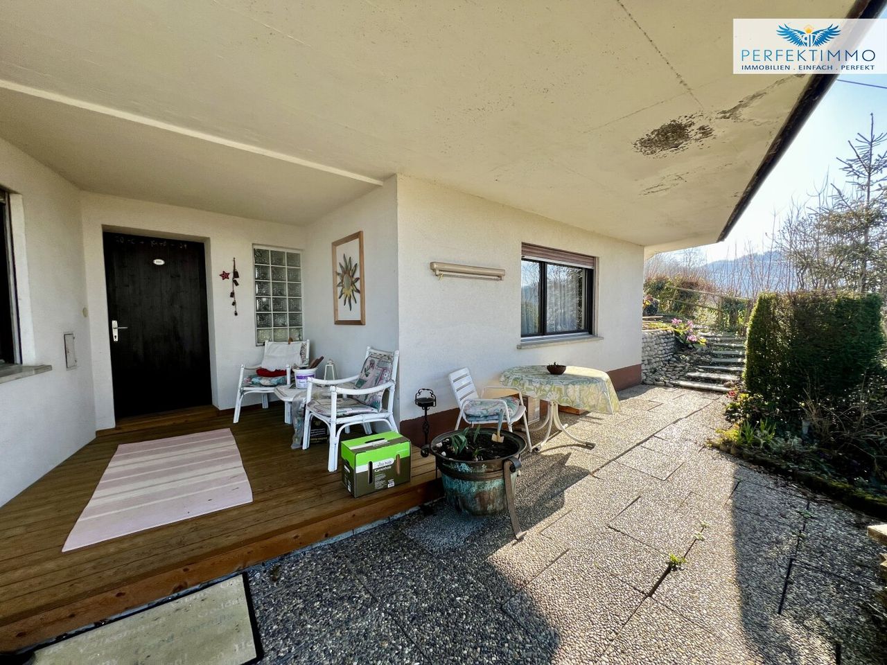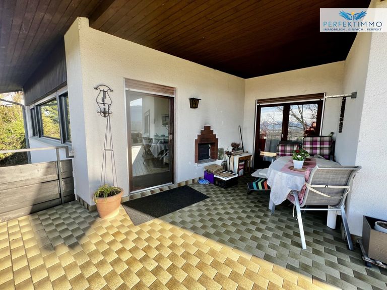 Der Außenbereich beeindruckt durch einen gepflegten Garten mit einer einladenden Steinterrasse, die ebenfalls einen bezaubernden Panoramablick bietet. Die großzügige Terrasse bietet ausreichend Platz für diverse Sitz- und Liegemöglichkeiten.