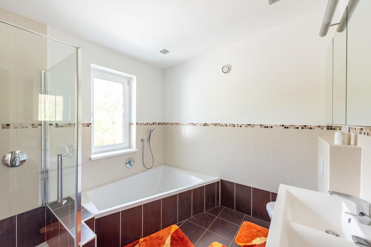Im Obergeschoss befinden sich ein geräumiges Schlafzimmer und zwei weitere Zimmer, die sich ideal als Kinderzimmer oder Büro eignen. Ein stilvolles Badezimmer mit Badewanne und Dusche rundet das Angebot ab und bietet Ihnen pure Entspannung nach einem langen Tag.
