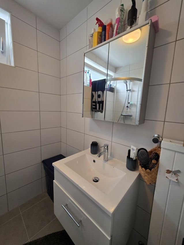 Das Obergeschoss verfügt über ein weiteres Badezimmer, eine separate Toilette, zwei Schlafzimmer sowie eine Wohnküche mit Zugang zum Balkon.