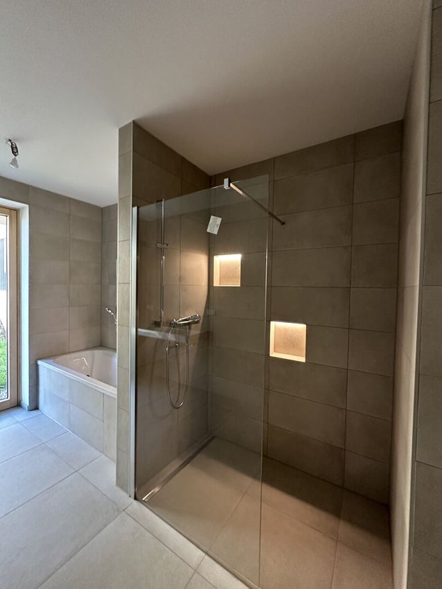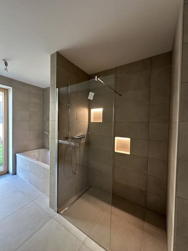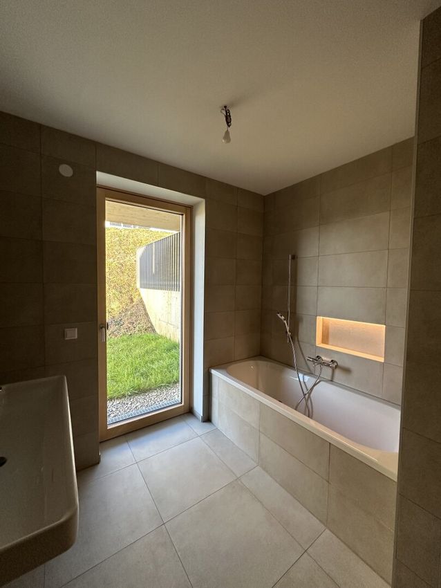 - Helles Badezimmer mit Fenster, Badewanne und Dusche