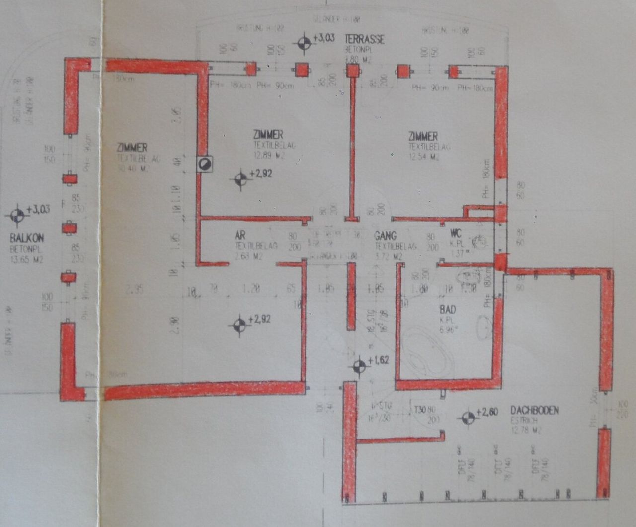 Obergeschoss: Gang (ca. 3,75 m²), Badezimmer (ca. 6,96 m²), WC (ca. 1,37 m²), Zimmer mit Balkonausgang (ca. 12,54 m²), Zimmer mit Balkonausgang (ca. 12,89 m²), Schlafzimmer mit Balkonausgang (ca. 33,03 m²), Dachbodenzimmer (ca. 12,78 m²) Nord-Balkon (ca. 9,80 m²), West-Balkon (13,65 m²).