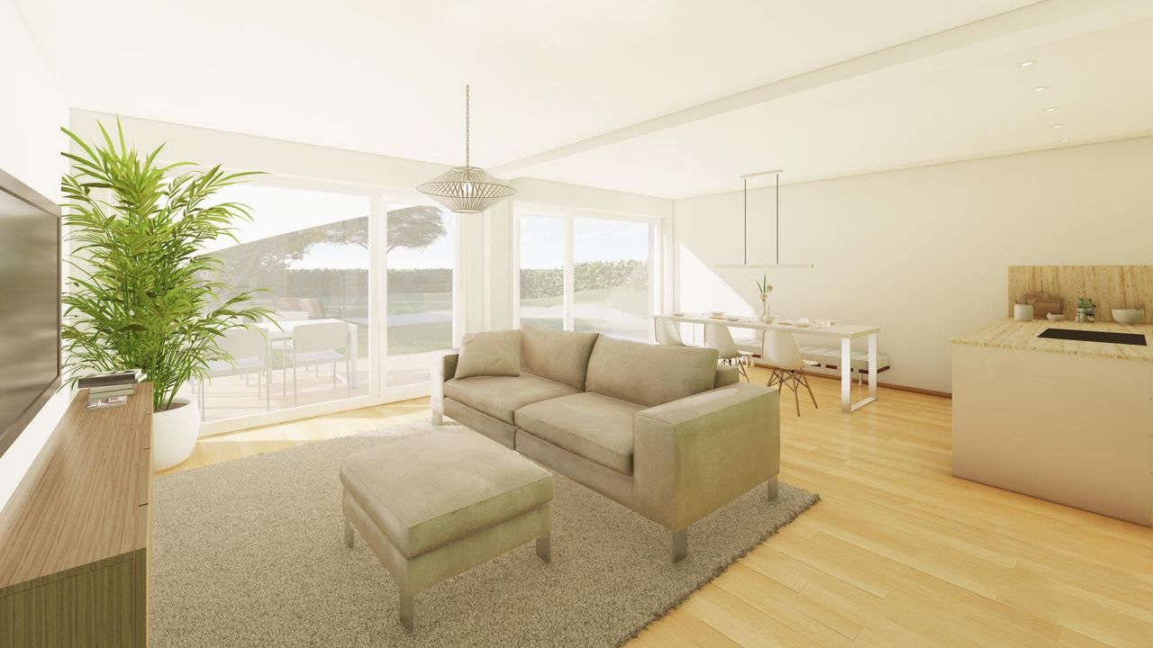 Die modernen Häuser in ökologischer, massiver Holzbauweise bieten einen großzügigen, lichtdurchfluteten Wohnbereich mit bodentiefen Fenstern und Austritt auf die Terrasse in südlicher Ausrichtung.