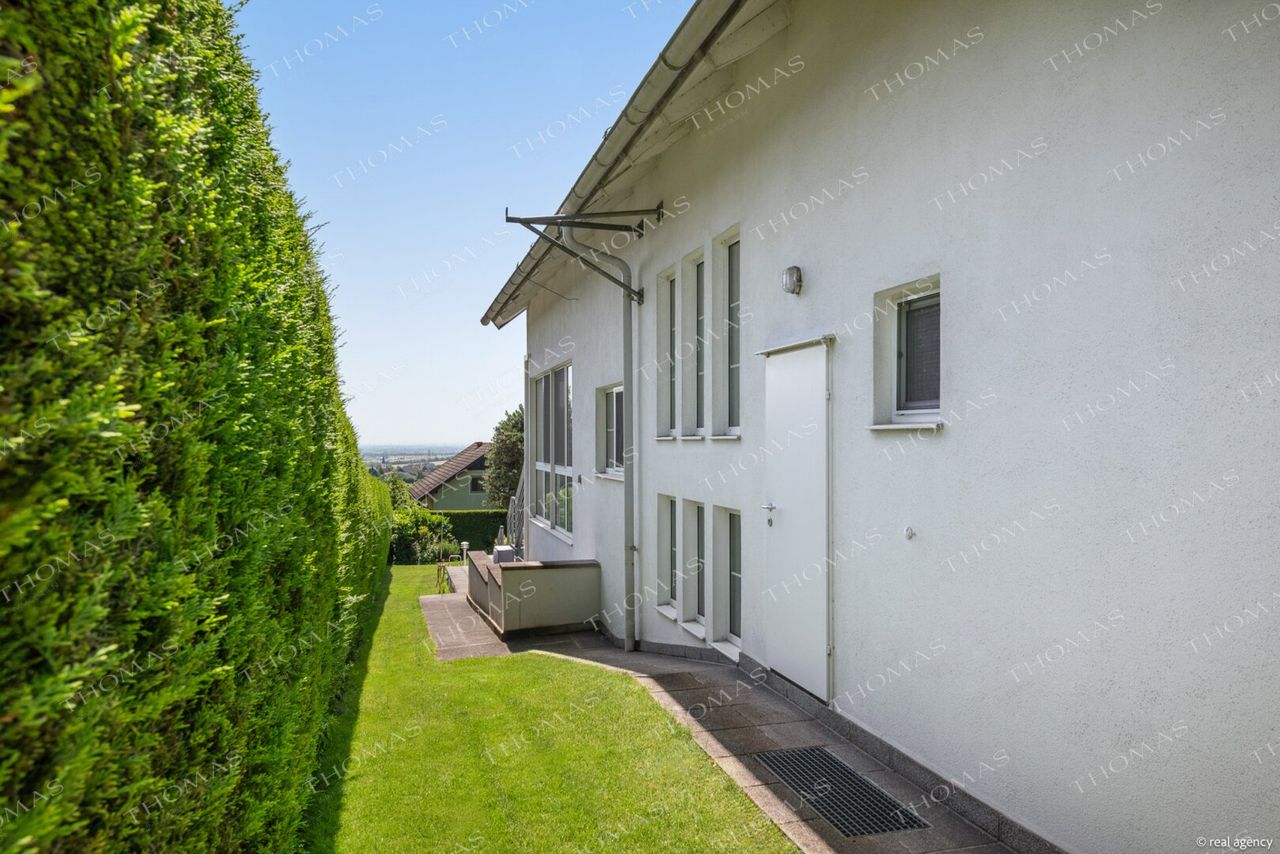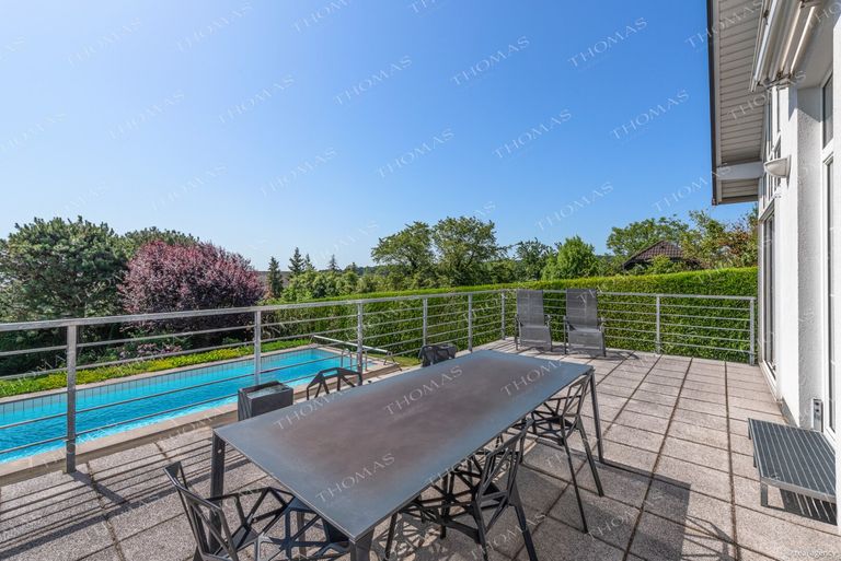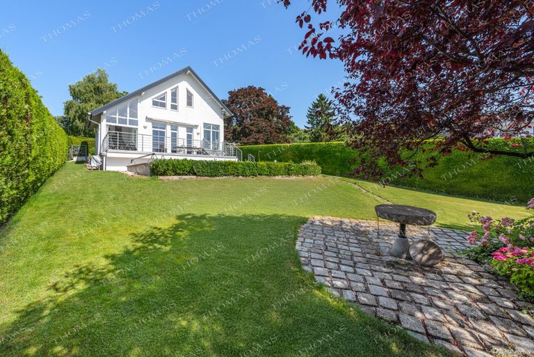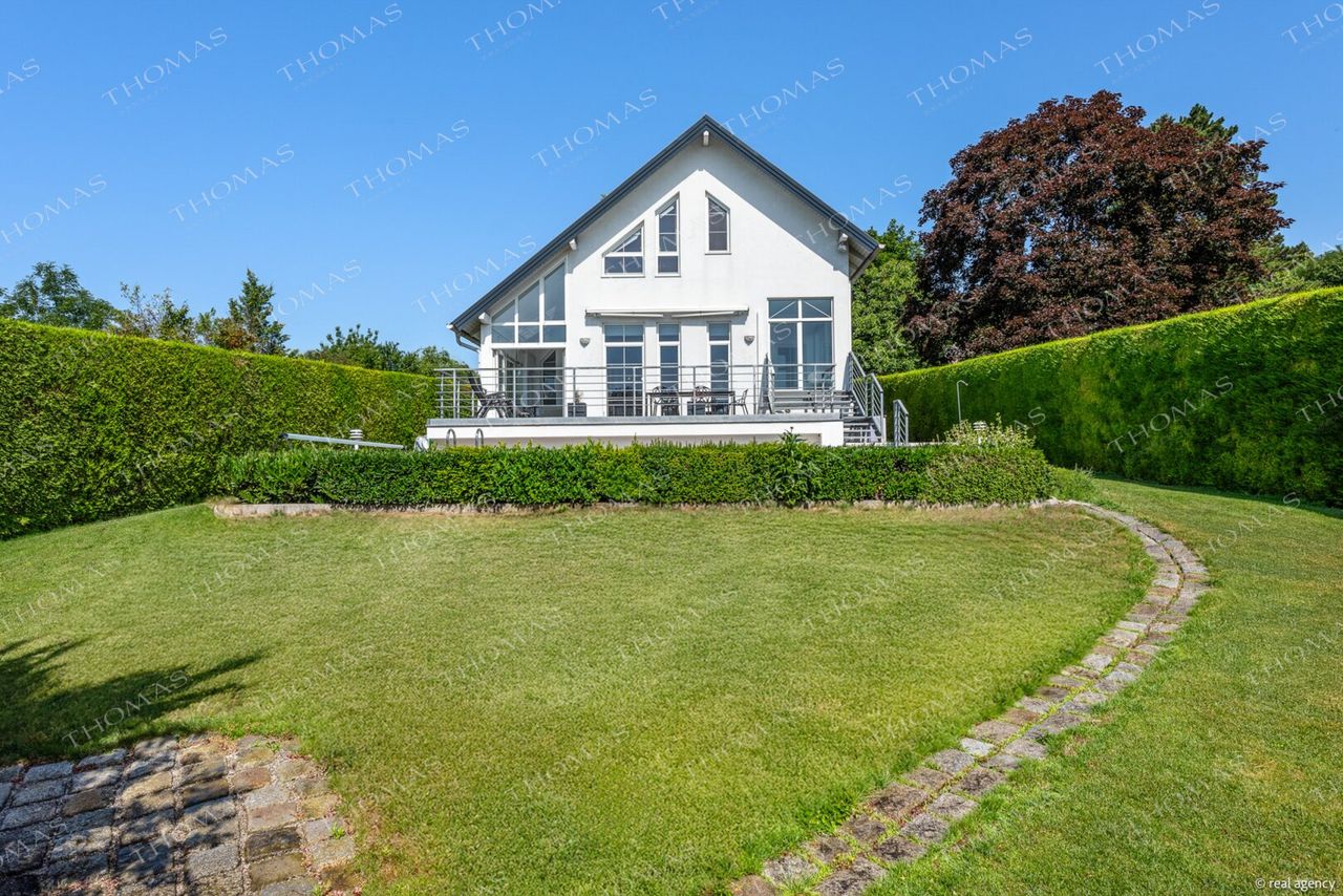 The well-maintained single-family home was built 1991 with solid construction and offers a generous plot of approximately 850 m², with a total usable area of around 408 m², including approximately 323 m² of living space. The thoughtful architecture and high-quality fittings create a living atmosphere of the highest class.