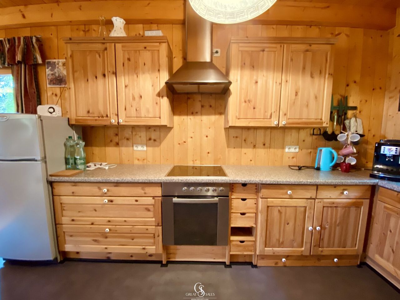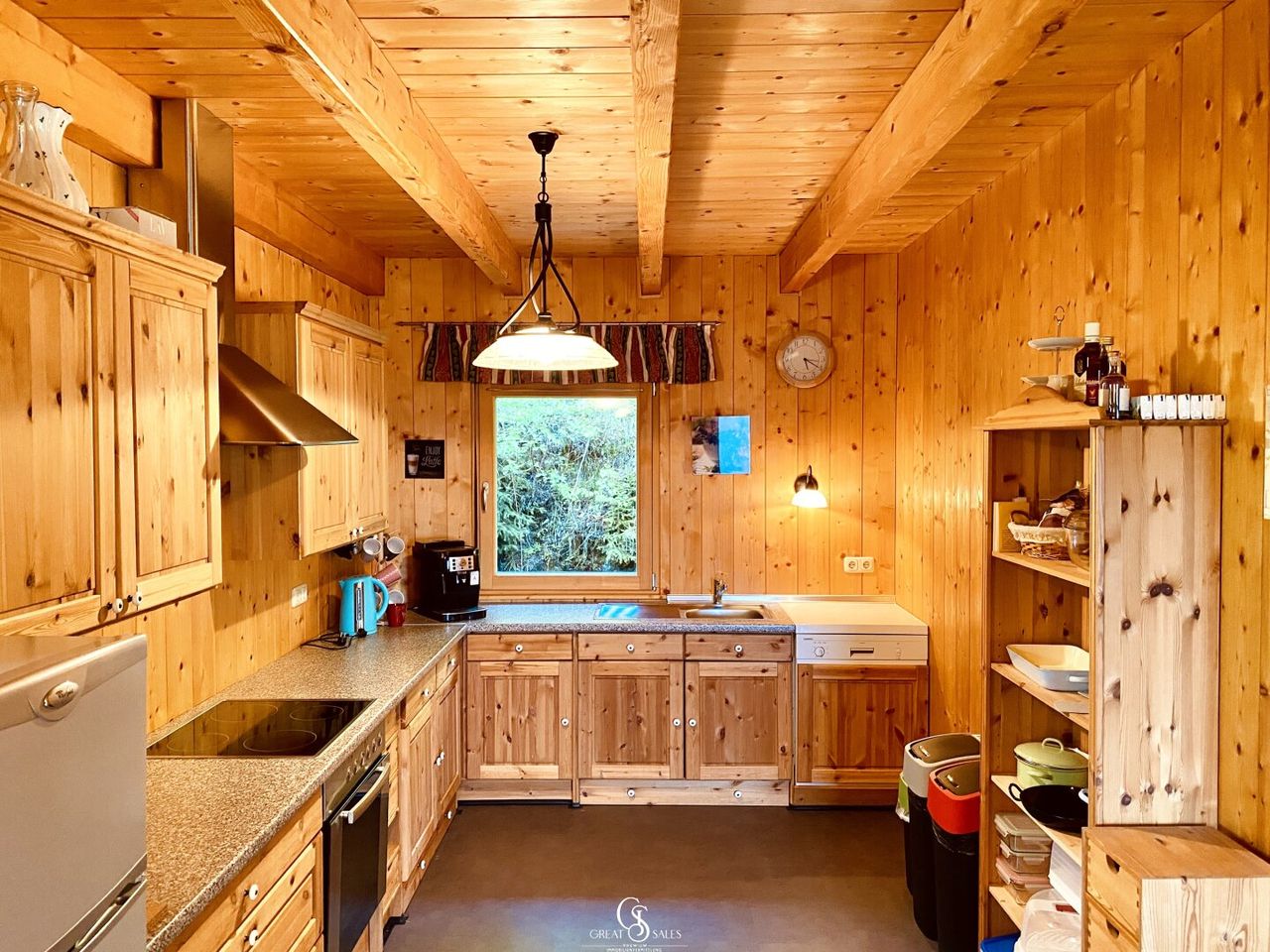 Die angrenzende Küche ist voll ausgestattet: Ceranfeld, Backofen, Geschirrspüler, Kühlschrank mit Eisfach, Kaffeemaschine sowie zahlreiche Schränke und Regale bieten alles für den täglichen Bedarf.