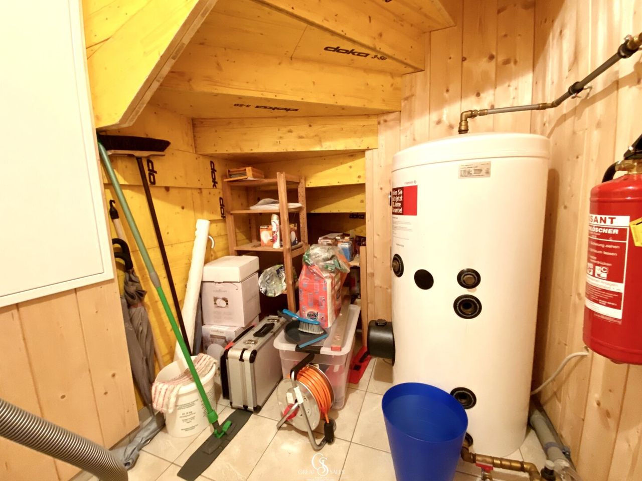 Beheizt wird das Haus wahlweise über den Kachelofen oder Elektro-Radiatoren. Ein Boiler sorgt für die Warmwasserversorgung.