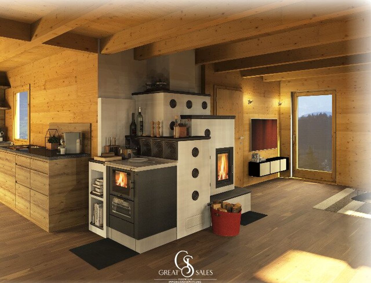 Ein großer Kachelofen sorgt für wohlige Wärme und lädt zum Entspannen ein. Dieser wird aktuell neu gebaut und ein Tischherd wird ebenso integriert. Eine gemütliche Couch, der TV-Flachbildschirm sowie der direkte Zugang zur Terrasse und in den Garten machen diesen Bereich besonders attraktiv.