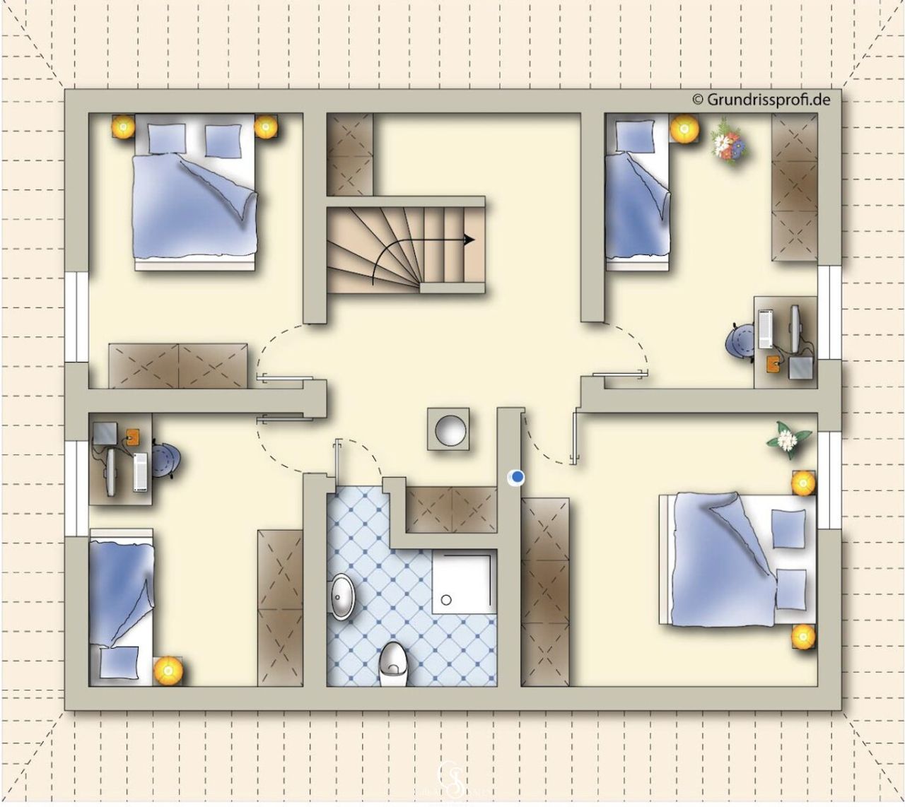 Im Obergeschoss erwartet Sie ein Vorraum, der dank des Kachelofen-Anteils angenehm beheizt wird. Vier Schlafzimmer– jeweils mit Doppelbett (1,80 m x 2,00 m), Kleiderschrank und Nachttischen – sorgen für erholsame Nächte. Alle Fenster sind mit Rollläden ausgestattet, die vollständige Verdunkelung ermöglichen. Ein weiteres Badezimmer mit Dusche, Waschbecken und Waschmaschinenanschluss ergänzt das Raumangebot.