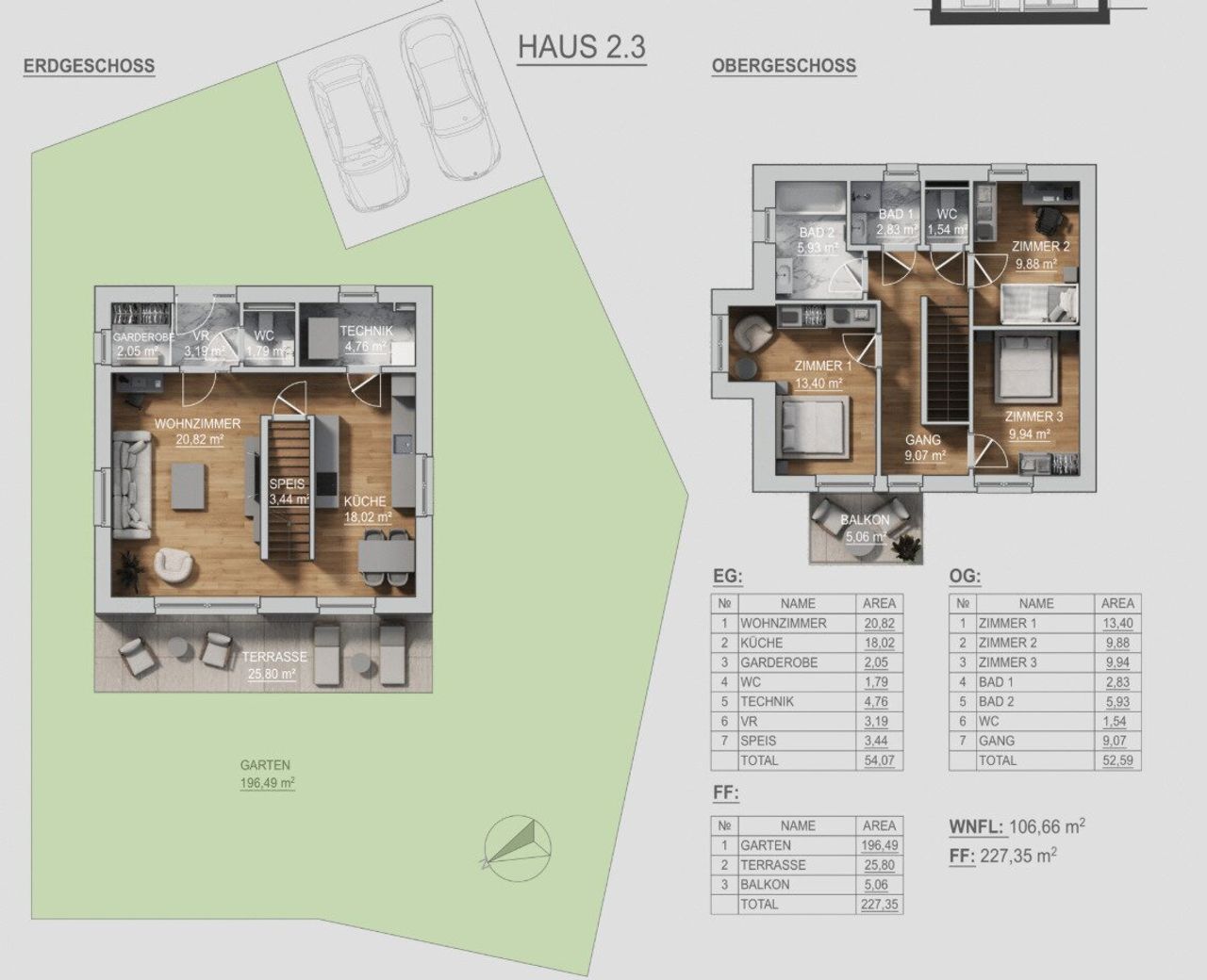 Das Obergeschoss verfügt über drei Schlafzimmer, ideal für Familien oder Paare, die flexible Wohnmöglichkeiten benötigen. Zwei Badezimmer sowie ein zusätzliches WC sorgen für hohen Wohnkomfort. Der Gang ist großzügig gestaltet und bietet Platz für Stauraum oder Arbeitsbereiche.