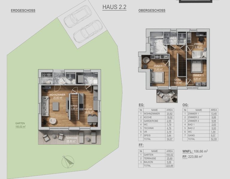 Im Erdgeschoss befindet sich ein heller, zentraler Wohnbereich mit direktem Zugang zur Terrasse und in den Garten. Die offene Küche ist harmonisch in den Wohnraum integriert. Zusätzlich gibt es einen Vorraum, eine Garderobe, ein separates WC sowie einen Technikraum und eine praktische Speisekammer.