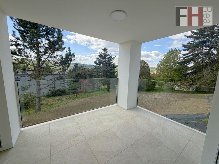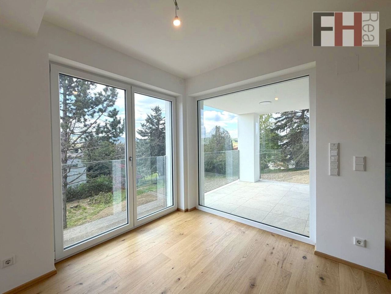 Über den großen überdachten Eingangsbereich, in dem sich auch die beiden PKW Stellplätze befinden, betreten Sie das Haus, das sich durch seine Ausrichtung im Inneren angenehm hell und freundlich präsentiert. Von hier aus gelangen Sie über den Vorraum und den Flur zum knapp 35m² großem Herzstück des Hauses, dem 23,5m² großen lichtdurchflutenden Wohnzimmer mit Essbereich und französischem Fenster sowie zur offenen Küche mit über 11m², die hochwertig, modern und vollausgestattet ist. Von diesen Räumlichkeiten aus betritt man die etwa 9m² große überdachte Terrasse mit herrlichem Ausblick in den Wienerwald und den eigenen Garten. Erwähnenswert sind hier die Glaswände anstatt eines Geländers, welche ein Gefühl von Weite und Offenheit zur herrlichen grünen Umgebung vermitteln.