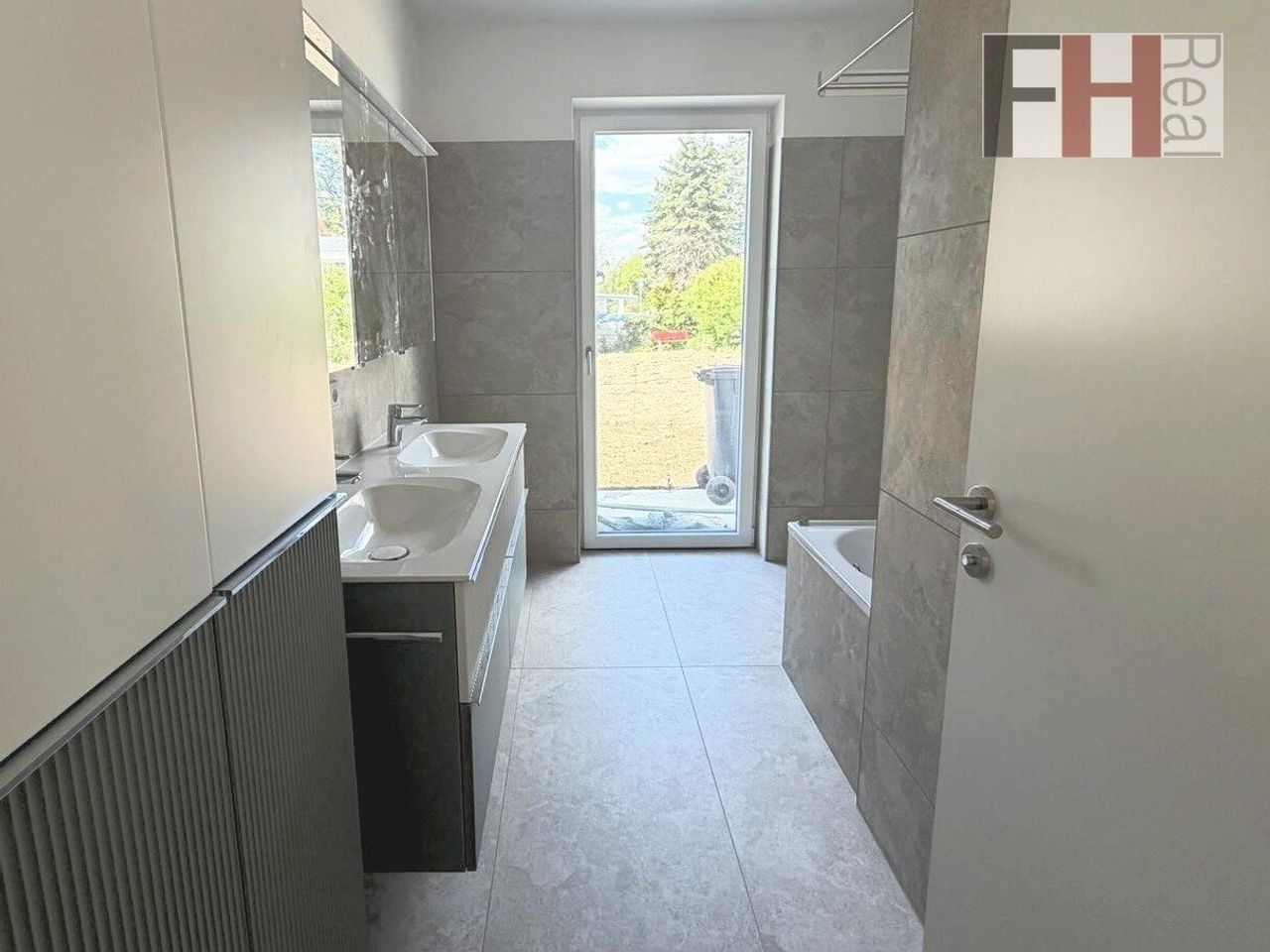 Auf dieser Ebene befindet sich außerdem ein großes Zimmer mit ca. 21,5m², das durch eine raumteilende Wand beispielsweise als Schlafzimmer mit integriertem Schrankraum oder Arbeitszimmer genützt werden kann. Ebenfalls hier gelegen sind das WC und das geschmackvoll eingerichtete Bad mit barrierefreiem Duschbereich, einer Badewanne mit hochwertiger Glasschiebewand und einem Doppelwaschbecken. Eine Terrassentür nach draußen sorgt auch hier für ausreichend Tageslicht und Frischluft.