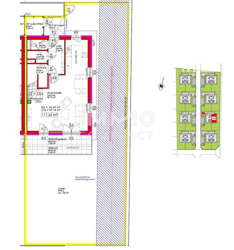 Die Erschließung der Reihenhäuser erfolgt über überdachte Eingangsbereiche, welche mit einem Außenabstellraum kombiniert sind.