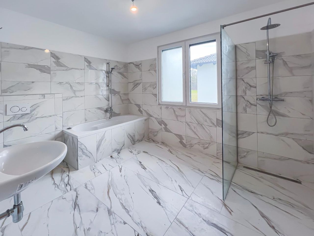 + Badezimmer mit Badewanne und begehbarer Duschkabine, Doppelhandwaschbecken und beheiztem Handtuchhalter
