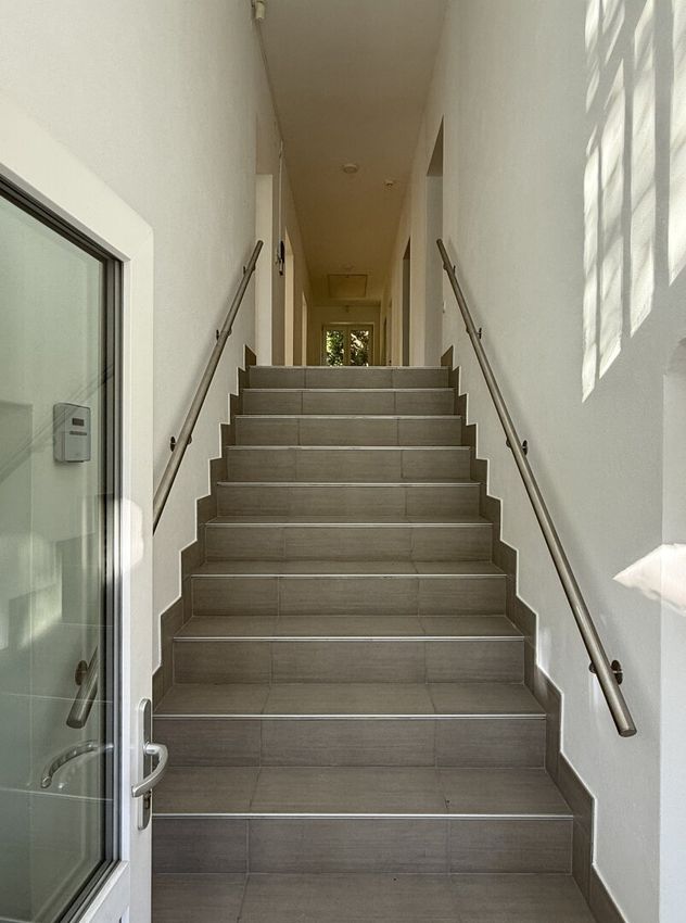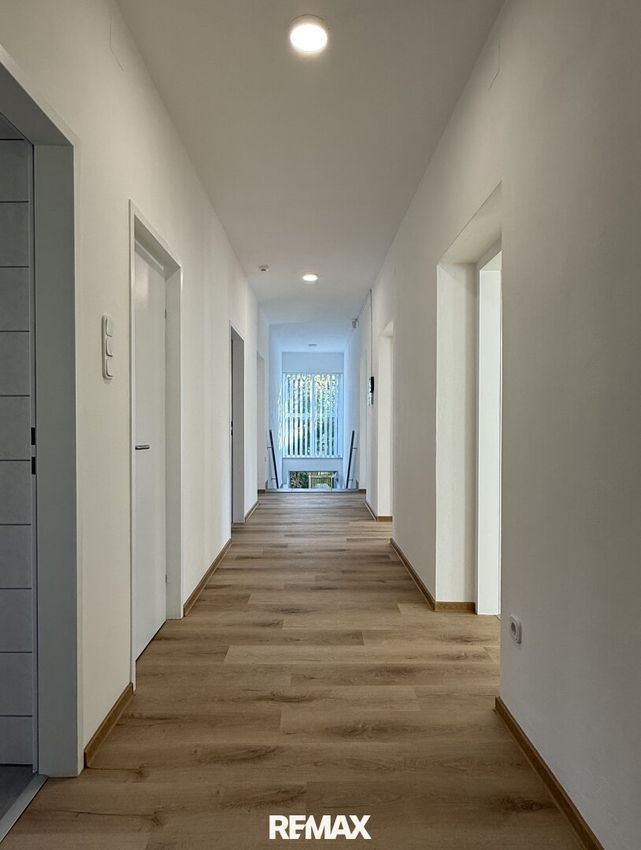 Da das Gebäude nicht unterkellert ist, übernimmt das Erdgeschoss die Rolle eines erweiterten Wohn- und Arbeitsbereichs. Wer Wohnen und Arbeiten verbinden möchte, findet hier eine ideale, ebenerdige Lösung. Der eigentliche Wohnbereich liegt im ersten Stock. Über den Eingang führt die Treppe hinauf, und ein langer Gang teilt das Geschoss in zwei angenehm strukturierte Seiten.