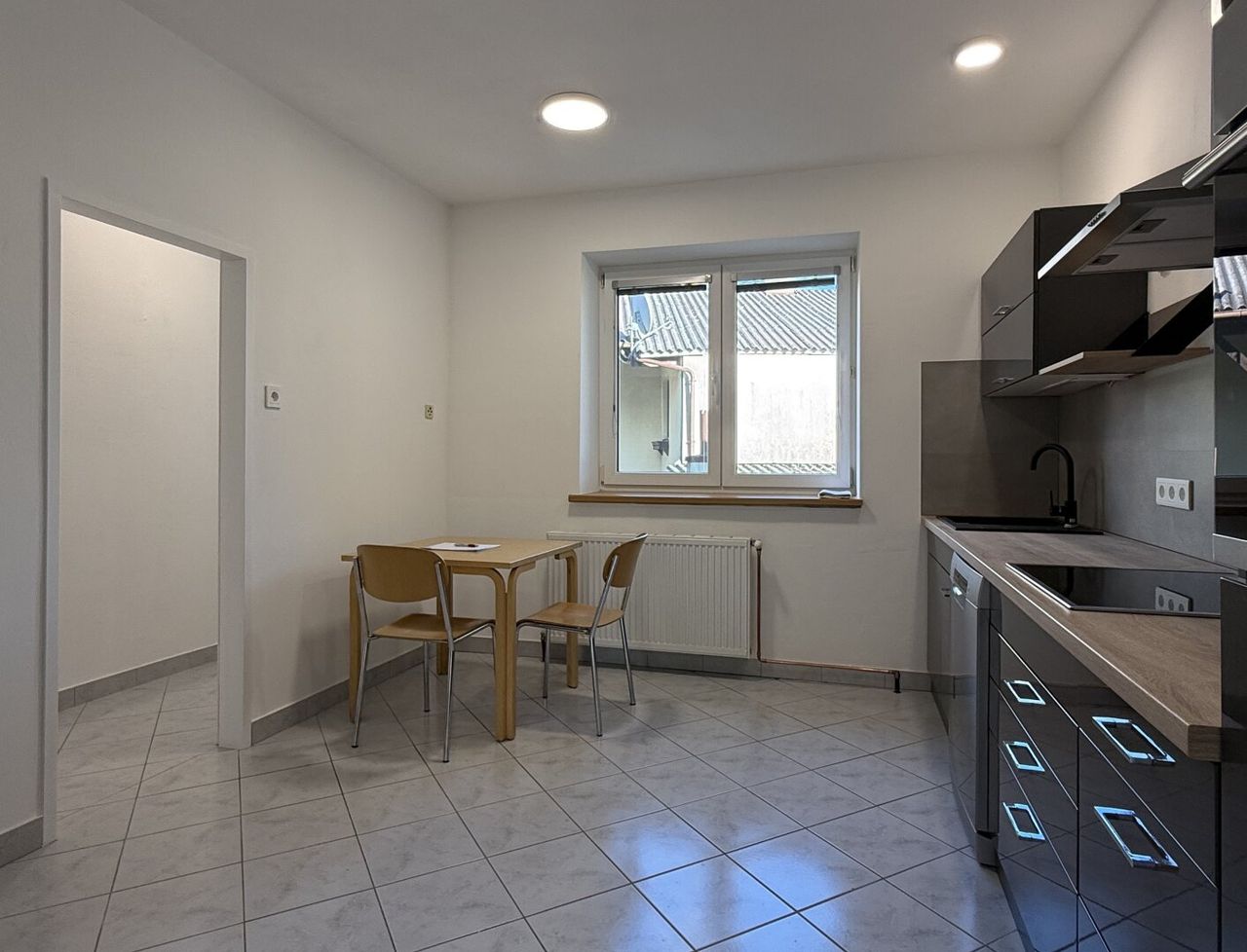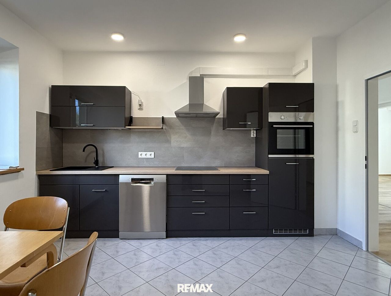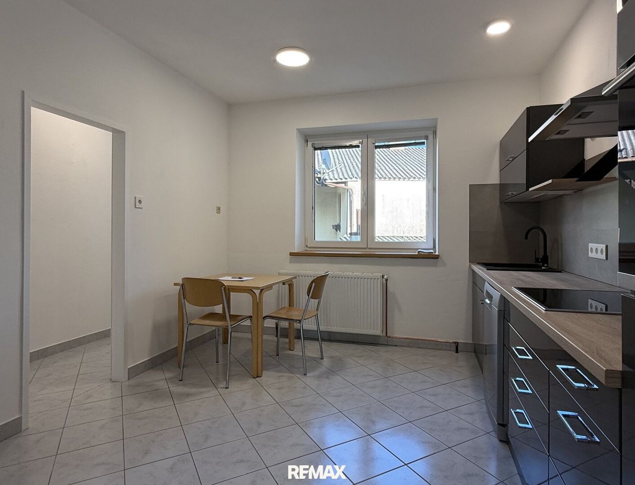 Hier öffnet sich das große Wohnzimmer, sonnig, großzügig, südostseitig ausgerichtet und an der Hausecke gelegen. Ein Balkon bietet den Blick in die umliegenden Gärten und hinüber zur Plöcking – ein ruhiges Panorama, das man so nicht überall findet. Gleich nebenan liegt die Küche, abgetrennt, gut ausgestattet und praktisch organisiert. Dahinter befindet sich ein frisch saniertes Badezimmer mit Wanne und Dusche.