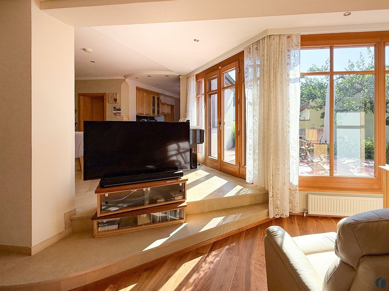 Herzstück des Erdgeschosses ist der großzügige Wohnbereich mit Fernseher, offener Küche und gemütlicher Essnische. Eine Klimaanlage sorgt hier – ebenso wie in den...
