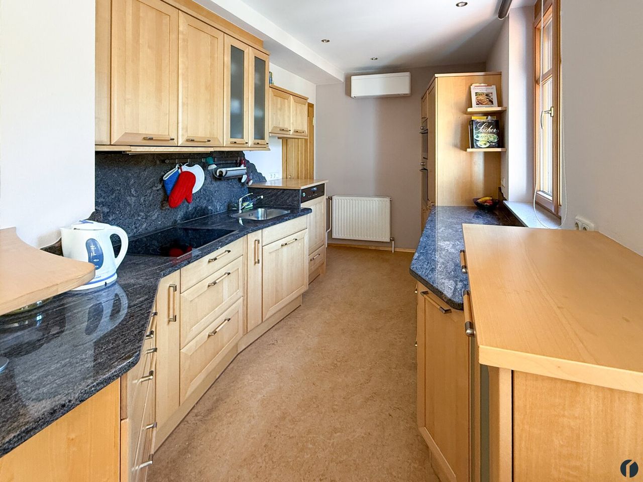 Herzstück des Erdgeschosses ist der großzügige Wohnbereich mit Fernseher, offener Küche und gemütlicher Essnische. Eine Klimaanlage sorgt hier – ebenso wie in den übrigen Wohnräumen – für ein angenehmes Raumklima. Die hochwertig ausgestattete Küche sowie eine praktische Speis mit zusätzlicher Arbeitsfläche bieten viel Platz zum Kochen und Verstauen.