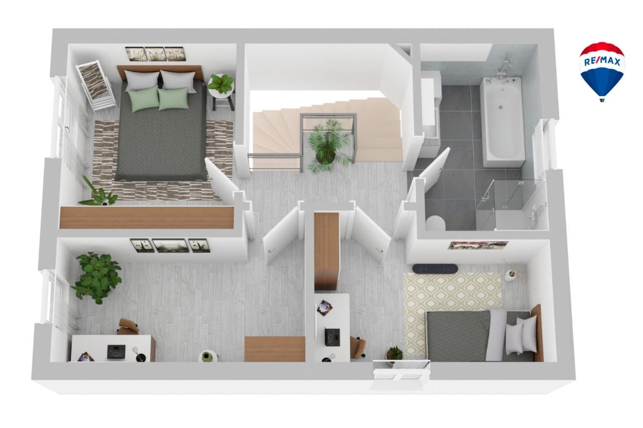 Über die Treppe gelangt man in den Vorraum des Obergeschoßes, wo man zentral die weiteren Räumlichkeiten betreten kann. Das Schlafzimmer, das Bad mit WC und die 2 Zusatzzimmer ergänzen die gute Raumaufteilung auf einer Wohnfläche von 83,70 m².