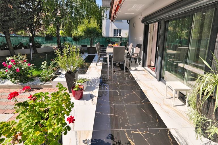 - Sauna Terrasse mit Marmorboden und Sonnenschutz
