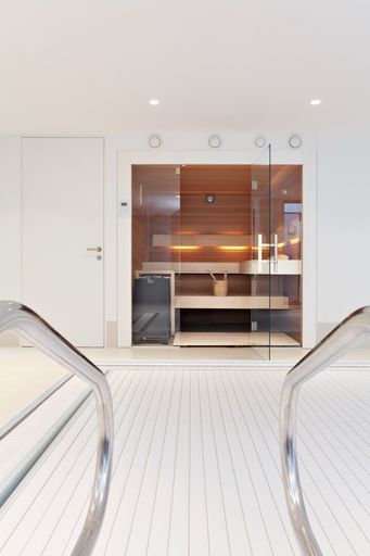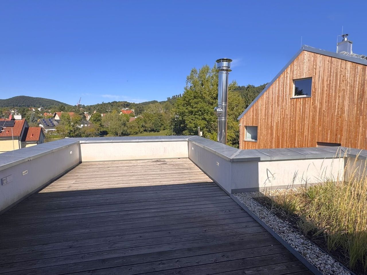Im Dachgeschoss - ebenfalls mit dem barrierefreien Personenlift, der dezent hinter einer weißen Tür verborgen ist, erreichbar - befindet sich neben einer wunderschönen, sonnigen Dachterrasse von 28 m2 (zuzüglich ca. 9 m2 Fläche für ein Outdoor-Pool) eine Toilette und eine kleine Teeküche. Ein Abend auf der Terrasse mit einem spannenden Film oder die Fußball-WM mit Freunden genießen? Kein Problem - die Sonnenterrasse ist mit einem Fernseh- und Internetanschluss ausgestattet und kann problemlos als Freiluft-Kino genutzt werden.