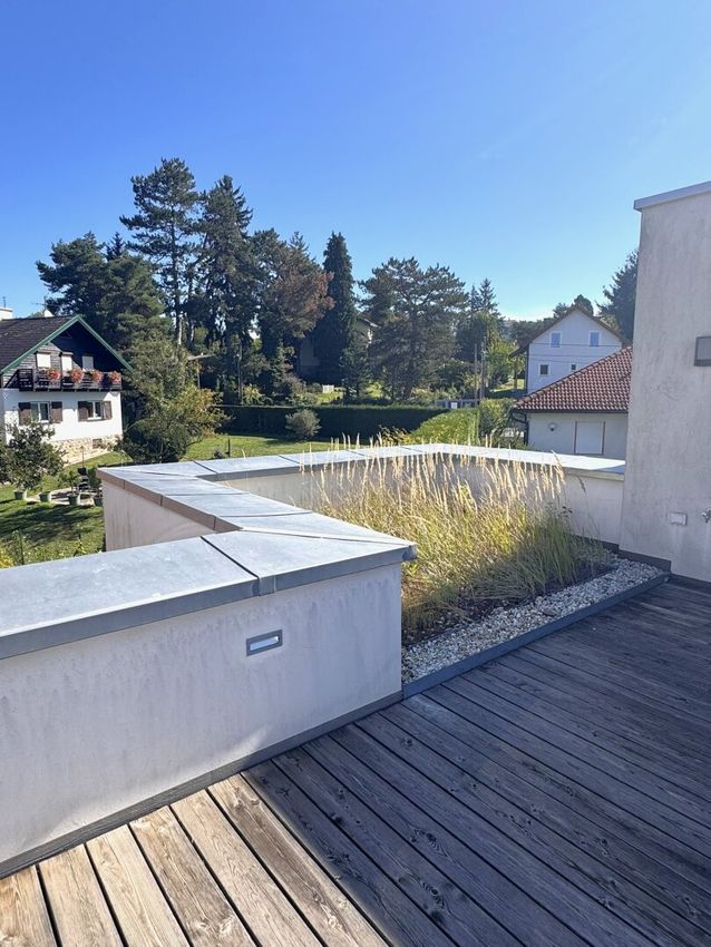 Vom Eingangsbereich aus, gelangt man in den hinteren Gartenbereich zu einer uneinsichtigen, kleinen Gartenterrasse, die als Salettl umgestaltet und begrünt werden kann. Nahezu alle Fenster sind mit Fliegenschutzgittern und elektrischen Außenjalousien versehen - in der Decke sind Gardinenschienen eingelassen. Die Terrasse ist mit einem hochwertigen, eigens gestrahlten Holzbelag ausgestattet.